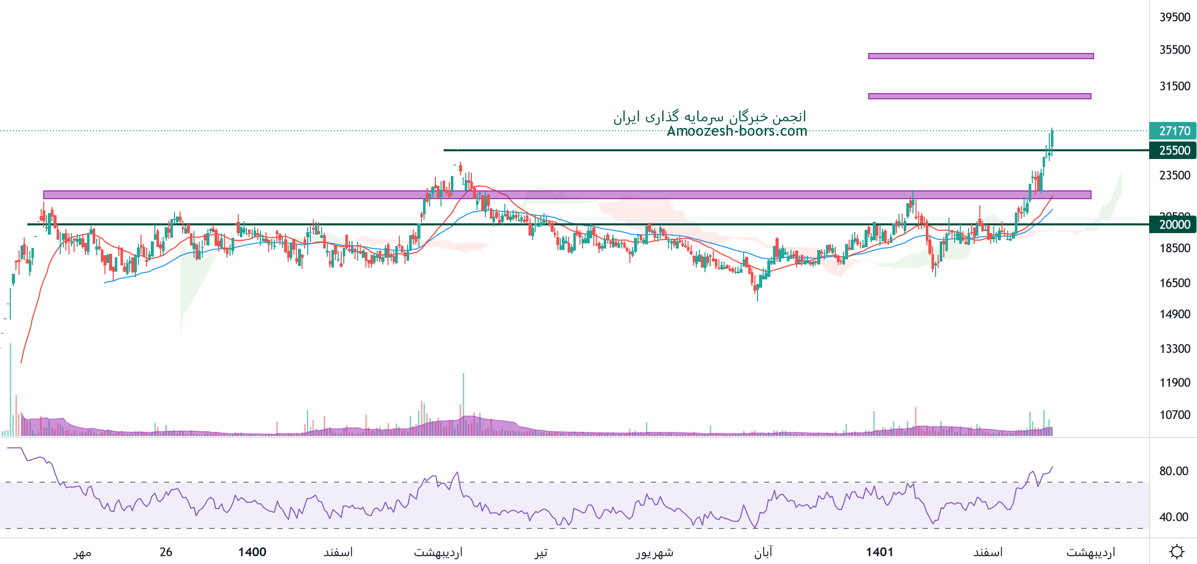 نماد سپید موفق به عبور از سطح مقاومتی 25500 ریال شده و در حال حاضر در موقعیت کم ریسک تکنیکالی قرار گرفته، در صورت تثبیت قیمت سهم سپید، حرکت سهم تا محدوده 30000 ریال محتمل خواهد بود، همچنین اولین محدوده حمایتی سهم 22000 ریال ارزیابی میگردد.