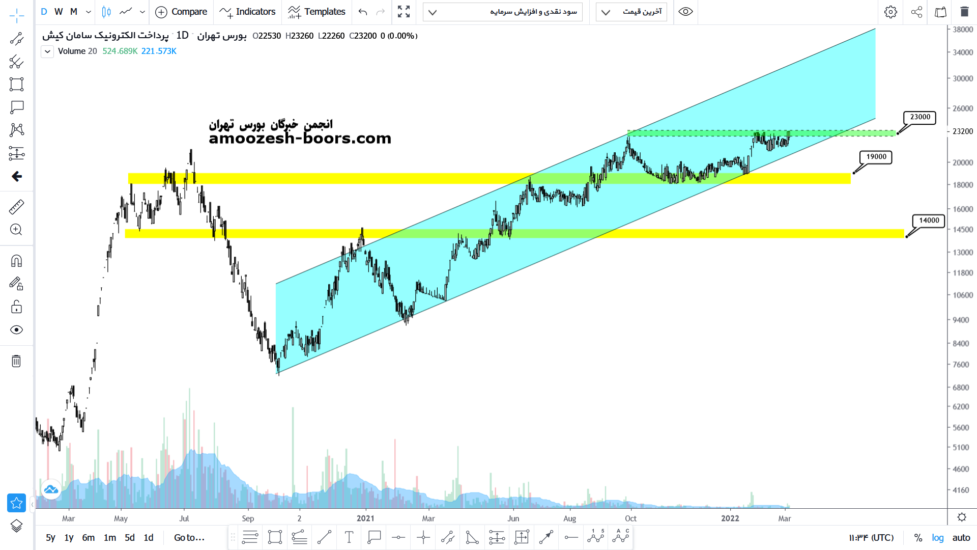 قیمت بعد از شکستن محدوده مقاومتی خود در حال پولبک زدن به این محدوده است و در صورت تثبیت صعود قیمت تا تارگت میدلاین کانال (25000 ریال) دور از ذهن نخواهد بود و در صورت از دست رفتن این محدوده حمایتی قیمت باز حم تمایل به تست کف کانال خود خواهد داشت.