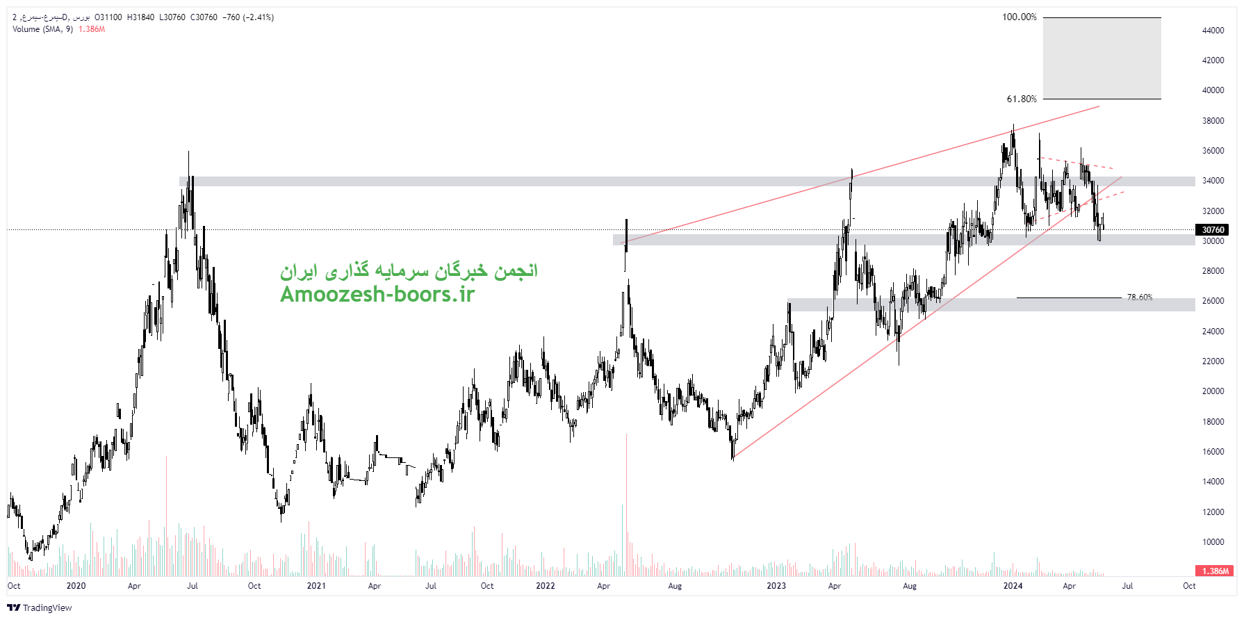 قیمت سهم سیمرغ بر روی حمایت ناحیه ۳۰۰۰۰ ریال قرار گرفته است. لذا در صورت ایجاد تقاضا در کلیت بازار و شکست مقاومت ناحیه ۳۴۰۰۰ ریال روند صعودی سهم سیمرغ ادامه داشته و لذا اهداف میان مدت سهم سیمرغ نواحی 40000 ریال و 45000 ریال در نظر گرفته خواهد شد. همچنین در صورت از دست رفتن حمایت ناحیه 30000 ریال نزدیکترین حمایت به سهم سیمرغ ناحیه ۲۶۰۰۰ ریال تعیین شده است.