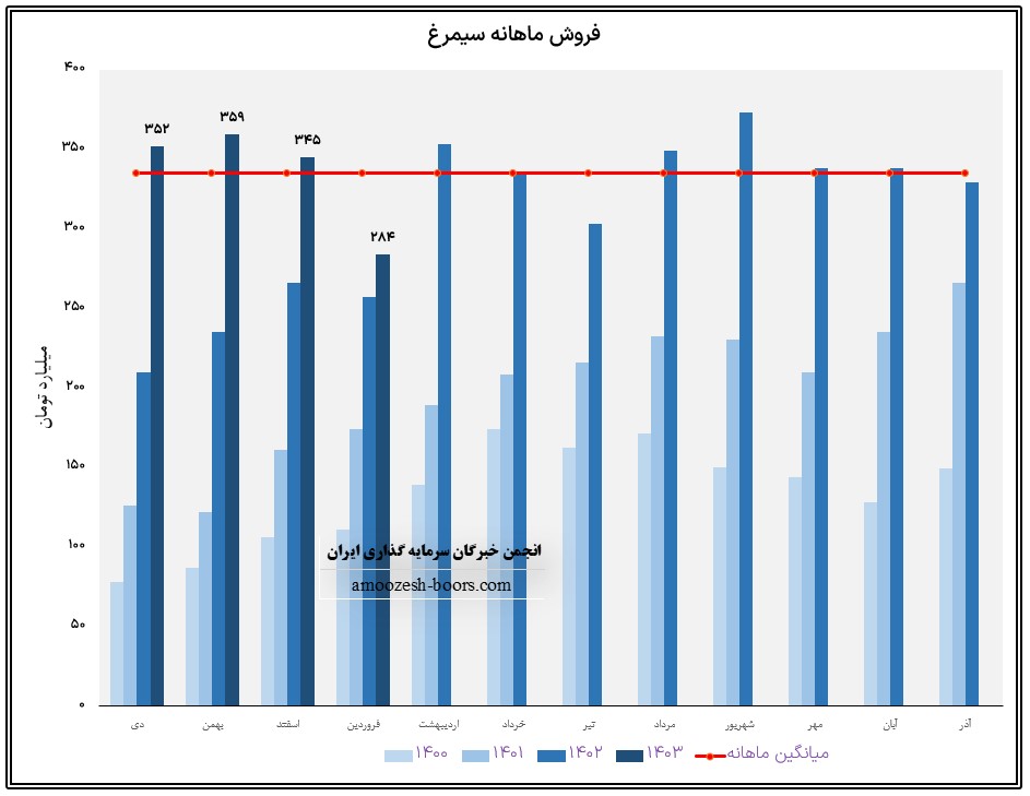 بر اساس عملکرد ماهانه شرکت سیمرغ ( سیمرغ ) در عملکرد منتهی به خرداد ماه سال 1403 مبلغ 345.7 میلیارد تومان را شناسایی نمود.