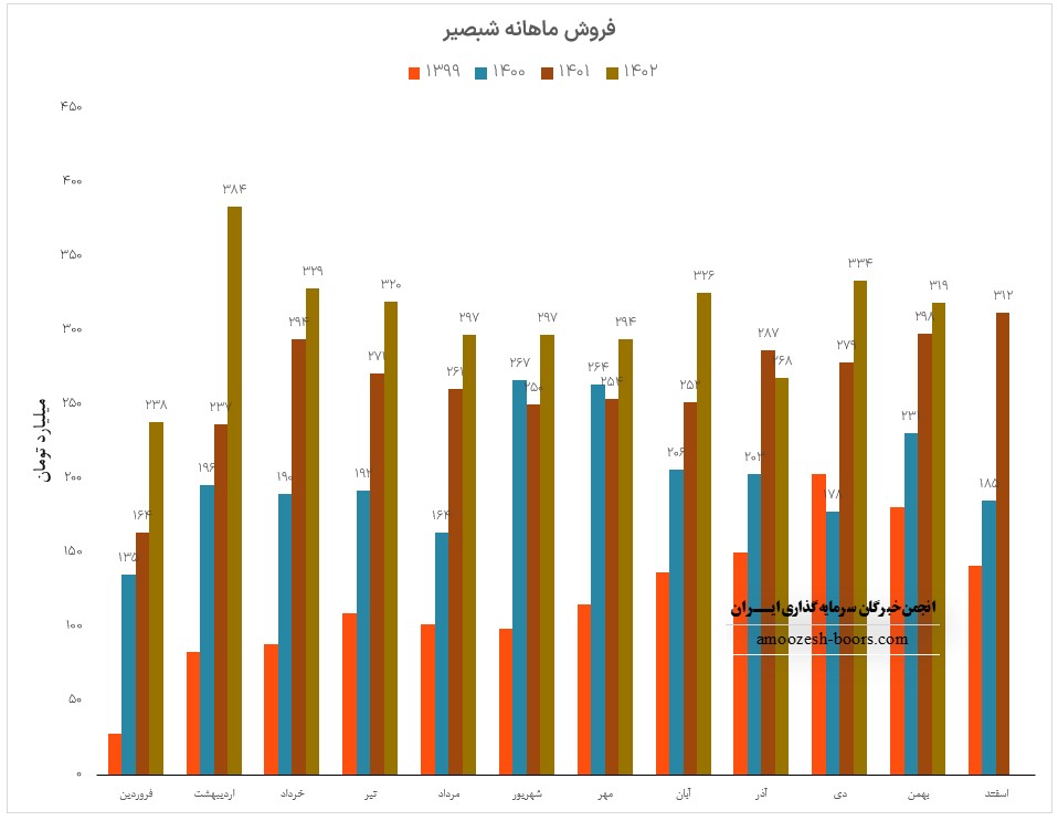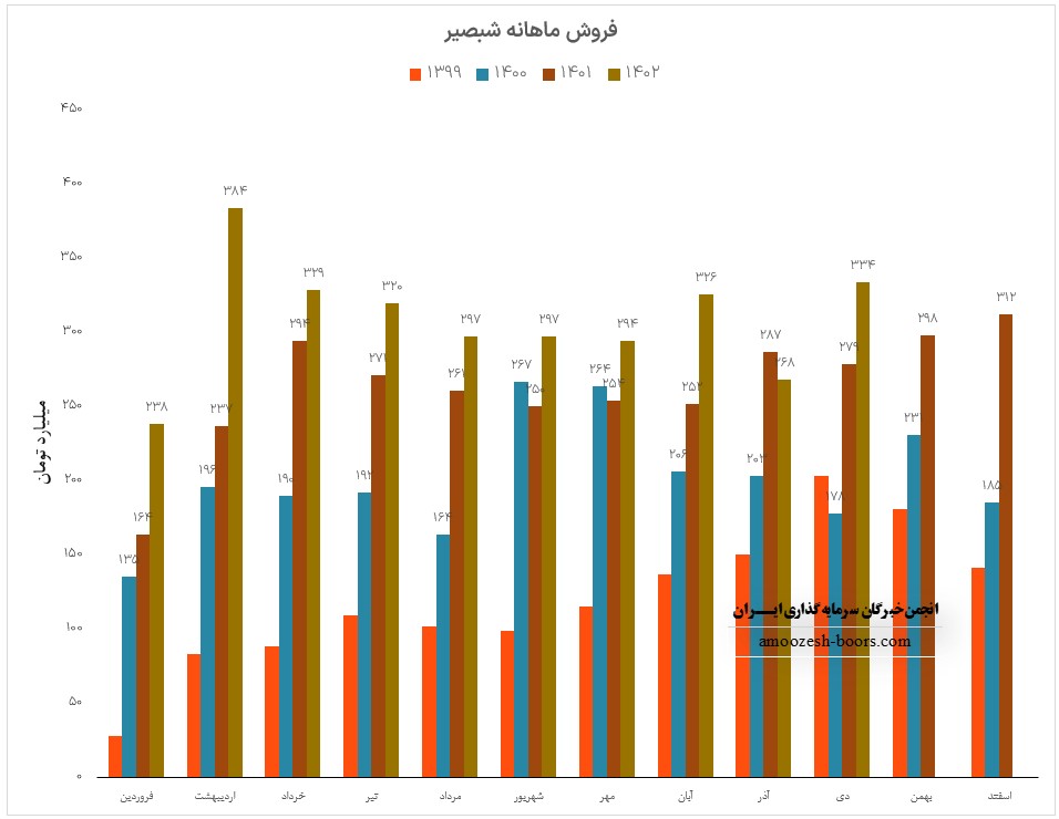 فروش آذر ماه سال 1402 سهم شبصیر 268 میلیارد تومان گزارش شده است که 87% از این رقم از طریق فروش داخلی و مابقی از طریق صادرات تامین گردیده است، تغییرات درآمدی شبصیر به شرح زیر میباشد: