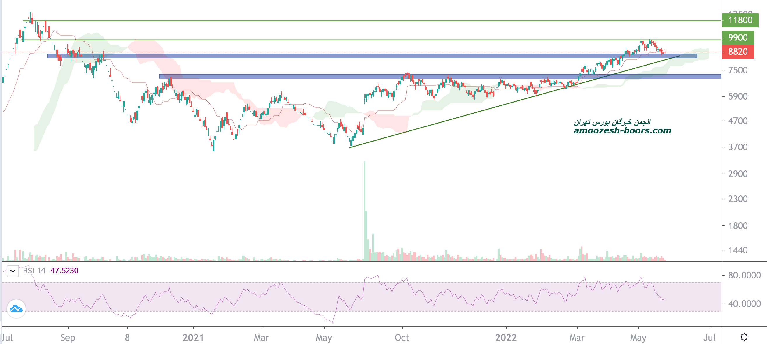 در حال حاضر قیمت سهم شبندر روی محدوده حمایتی استاتیک و نزدیکی حمایت خط داینامیک صعودی در محدوده قیمتی 8500 ریال قرار دارد در صورت تثبیت قیمت در این منطقه تارگت سهم 1000 و 1200 ریال در نظر گرفته خواهد شد و همچنین در صورت از دست رفتن این دو حمایت، حمایت بعدی سهم شبندر ناحیه 7400 ریال خواهد بود که در این صورت حد ضرر سهامداران فعال خواهد شد.