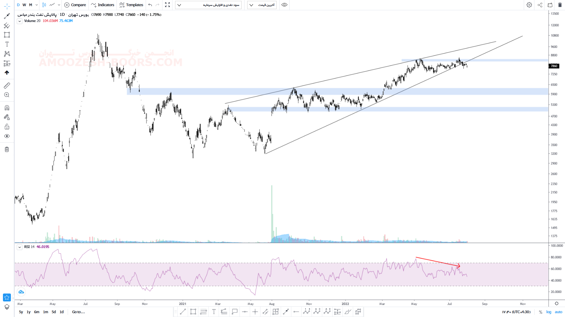 قیمت سهم شبندر با ایجاد واگرایی منفی در تست دوباره ناحیه مقاومتی مهم ۸۴۰ تومان وارد فاز اصلاحی شده و اکنون نیز با شکست خط روند صعودی خود در صورت تایید پولبک می تواند خود را تا ناحیه حمایتی ۶۰۰ تومان نیز برساند اما در صورت برگشت مجدد و شکست ناحیه مقاومتی ۸۴۰ تومان مقاومت بعدی سهم شبندر ناحیه سقف تاریخی 1000 تومان خواهد بود