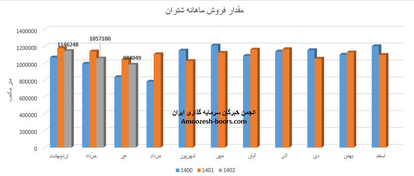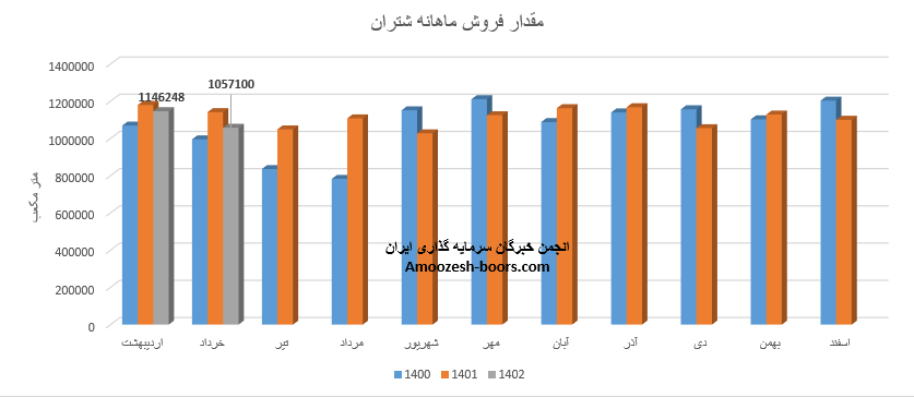 سهم شتران (پالایشگاه نفت تهران) در تیر ماه سال ۱۴۰۲ حدود بیش از 1/088/000هزار متر مکعب از محصولات خود را به فروش رسانده که از پرفروش ترین آن از نظر حجمی می توان به نفت گاز نهایی با سهم 462 هزار مترمکعب از فروش در رتبه اول و نفت کوره و مالچ با 198هزار مترمکعب در رتبه دوم به عنوان پرفروش ترین محصولات سهم شتران در این ماه اشاره کرد. همچنین حجم فروش کل تیر ماه شتران در مقایسه با ماه گذشته حدود 11% رشد پیدا کرده است.