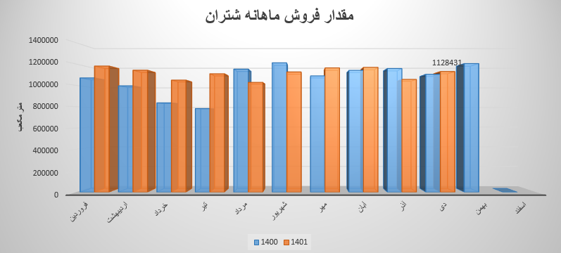 از انجایی که نرخ فروش محصولات نماد شتران هر به 3 ماه مشخص میگردد لذا بررسی درآمد ماهانه مقدور نمیباشد، از انجایی که این شرکت هنوز گزارش بهمن ماه خود را ارائه ننموده در بررسی مقدار فروش محصولات سهم شتران در دی ماه شاهد رشد 2 درصدی نسبت به مدت مشابه هستیم، همچنین مقدار فروش دی ماه نماد شتران که به میزان 1128431 مترمکعب بوده است تغییر محسوسی نسبت به متوسط ماهانه نداشته و نسبت به ماه قبلی نیز 7% رشد داشته است.