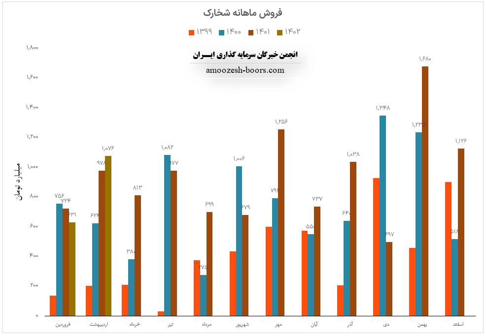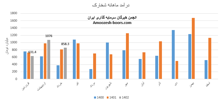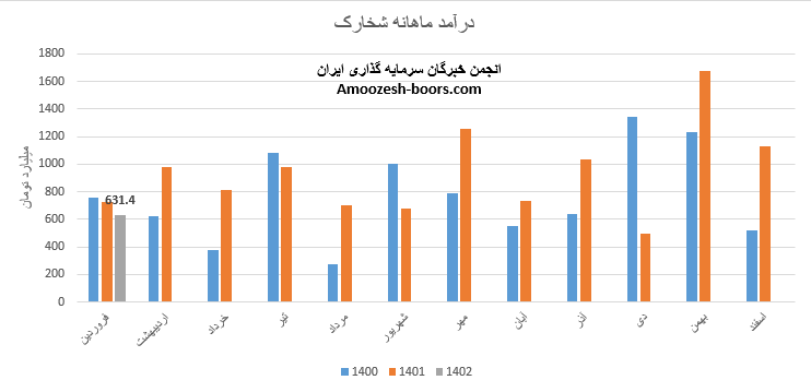 نماد شخارک (پتروشیمی خارک) در اردیبهشت ماه سال 1402 حدود مبلغ 1076 میلیارد تومان درآمد داشته که این میزان در مقایسه با ماه گذشته 71% و همچنین در مقایسه با مدت مشابه سال گذشته 10% رشد پیدا کرده است.