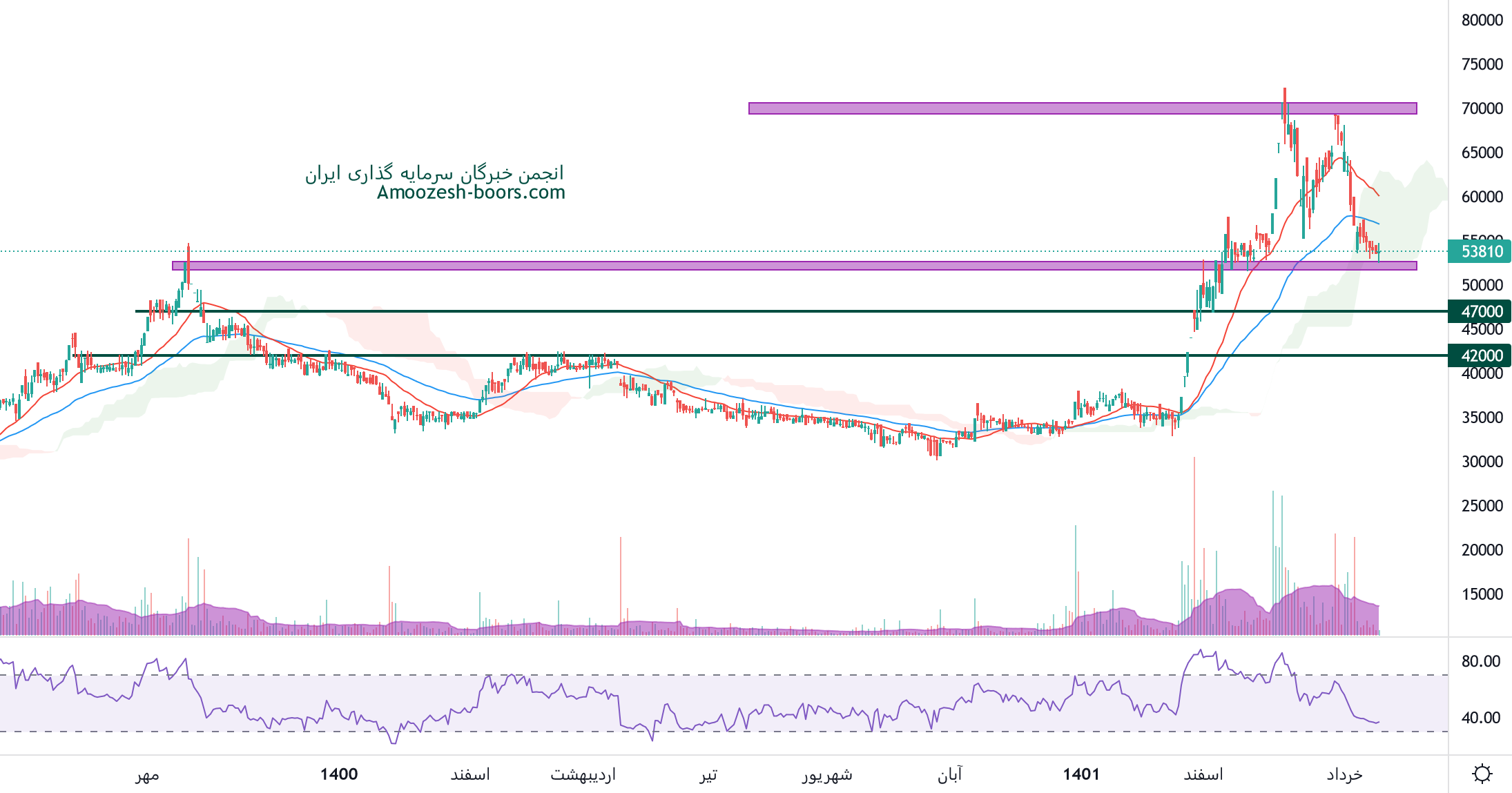 نماد شخارک که اصلاح نسبتا شارپی را تجربه نموده، در حال حاضر در حال ثبت کندل های سبز میباشد و مقاومت های پیش روی شخارک 47000 و 55000 ریال خواهند بود، همچنین در صورت از دست رفتن محدوده حمایتی ذکر شده، حمایت بعدی 33000 ریال در نظر گرفته خواهد شد.