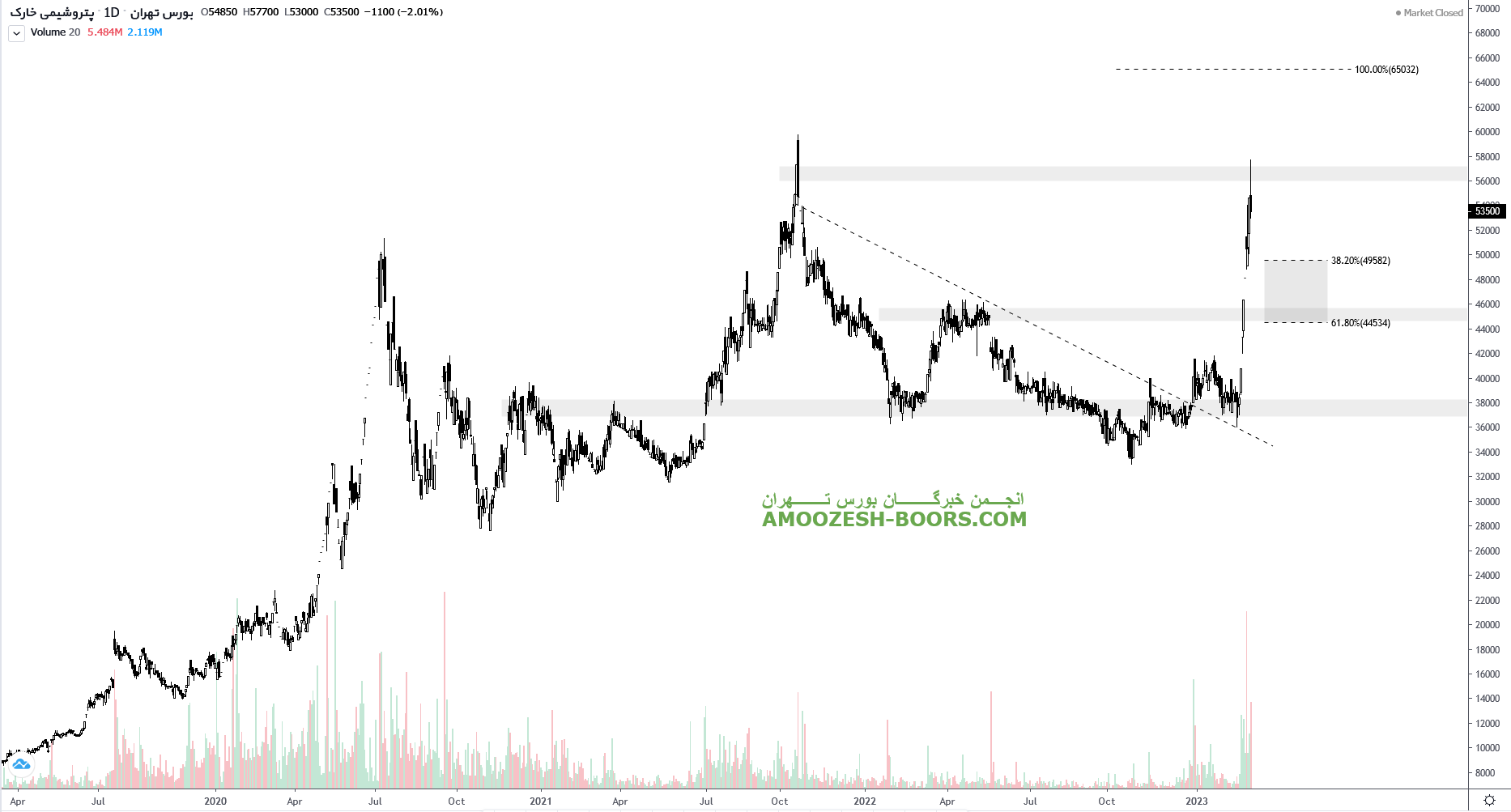 در صورت شکست مقاومت تاریخی ناحیه ۵۶۰۰ تومان، اولین مقاومت سهم شخارک ناحیه ۶۵۰۰ تومان تعیین شده است. اما در صورت بروز واکنش منفی نسبت به این ناحیه مقاومتی، حمایت ۵۰۰۰ تومان و پس از آن در صورت شکست حمایت ناحیه 4400 تومان میتوانند سد راه قیمت از ریزش بیشتر شوند.