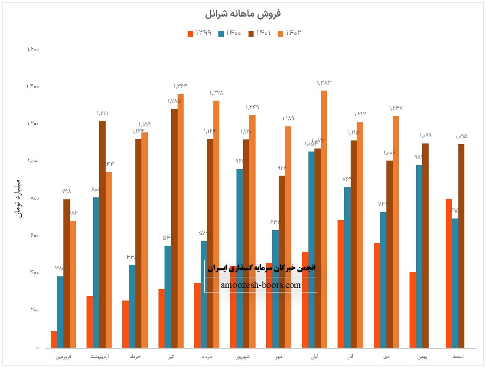فروش آذر ماه سال 1402 سهم شرانل 1212 میلیارد تومان گزارش شده است که 82% از این رقم از طریق فروش داخلی و مابقی از طریق صادرات تامین گردیده است، تغییرات درآمدی شرانول به شرح زیر میباشد: