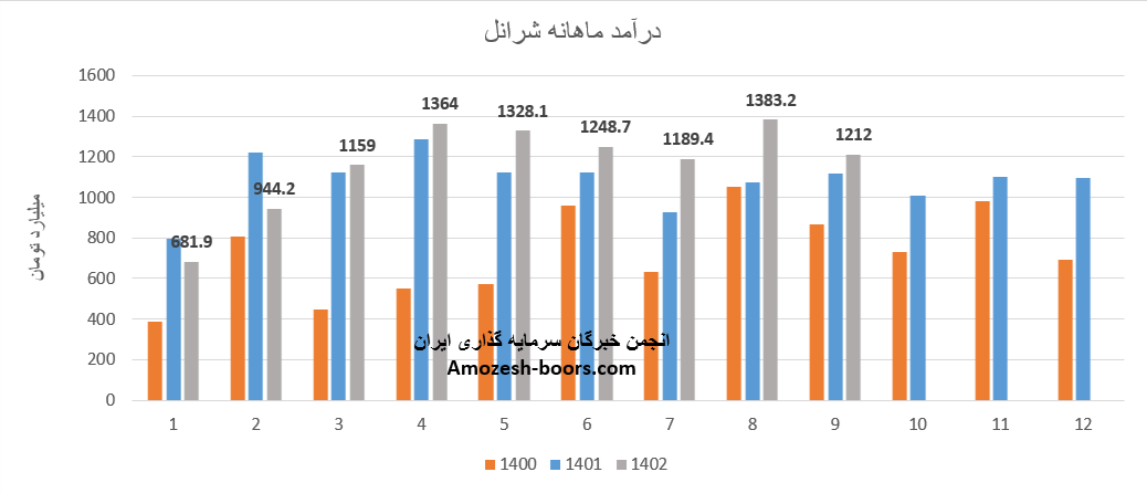 درآمد آبان ماه سال 1402 سهم شرانل 1383.2 میلیارد تومان بوده است که در مقایسه با ماه گذشته 16% رشد داشته است.