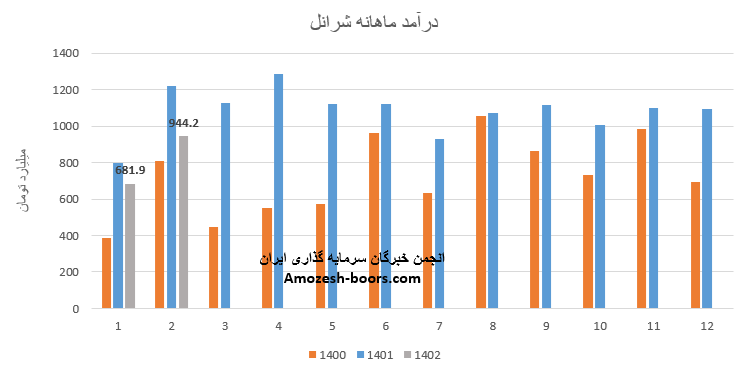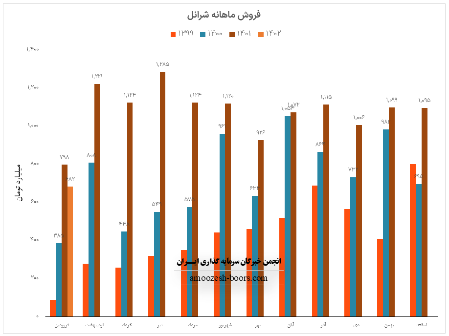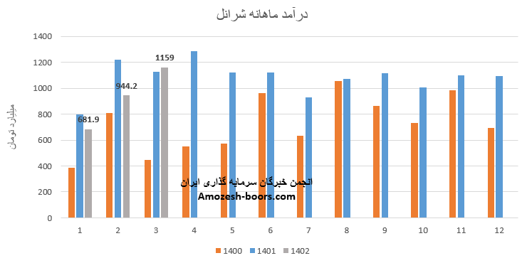 نماد شرانل (شرکت نفت ایرانول) در فروردین ماه 1402 حدود مبلغ 682 میلیارد تومان درآمد داشته که این میزان در مقایسه با ماه گذشته 38% و همچنین در مقایسه با مدت مشابه سال گذشته 15% افت پیدا کرده است.