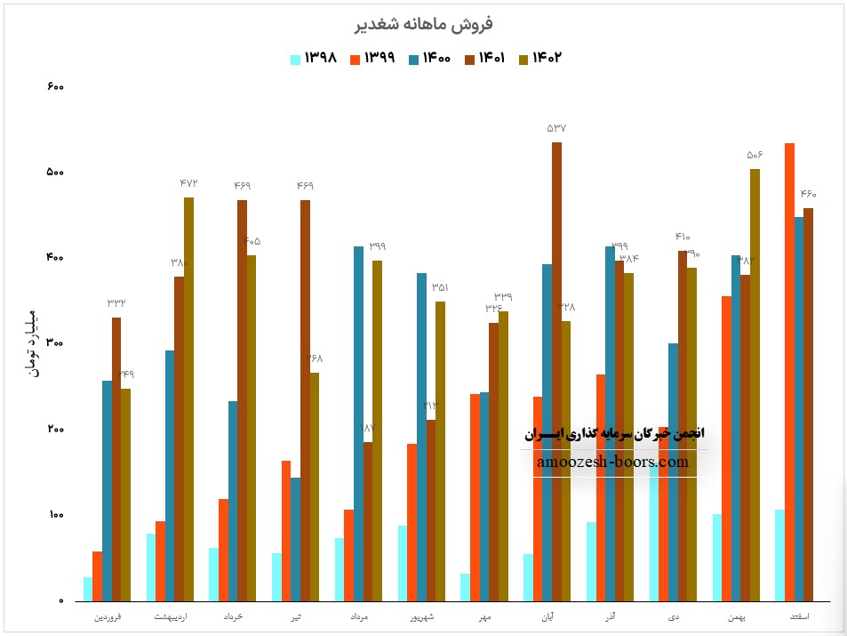 فروش آذر ماه سال 1402 سهم شغدیر 383.9 میلیارد تومان گزارش شده است که 85% از این رقم از طریق فروش داخلی و مابقی از طریق صادرات تامین گردیده است، تغییرات درآمدی شغدیر به شرح زیر میباشد: