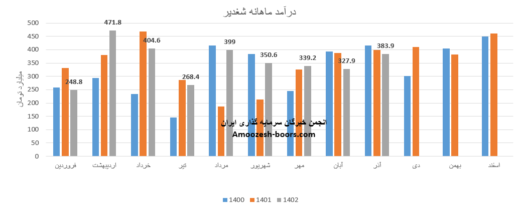 درآمد ماهانه نماد شغدیر نسبت به ماه گذشته 2% رشد، نسبت به متوسط ماهانه 10% رشد و نسبت به مدت مشابه 5% افت را تجربه نموده است.