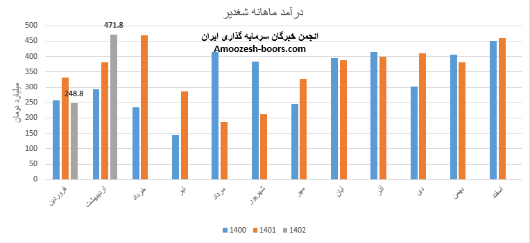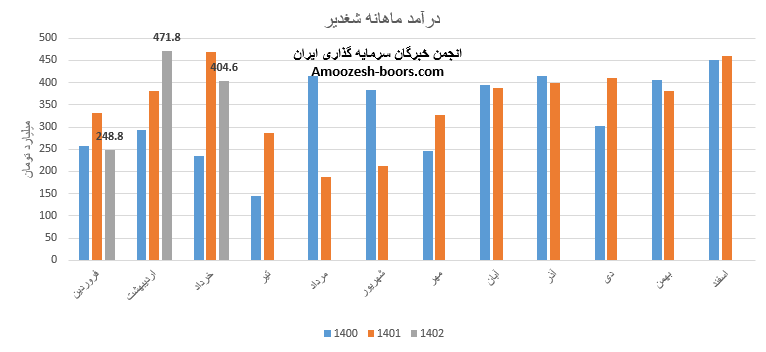 فروش نماد شغدیر در گزارش ماهانه فروردین ماه سال 1402 کاهشی شد و به میزان 248.8 میلیارد تومان رسید، درآمد سهم شغدیر نسبت به ماه گذشته 46% و نسبت مدت مشابه 25% کمتر است، تنها 8% از فروش ماهانه شغدیر از طریق بازار صادرات به دست آمد و مابقی محصولات پتروشیمی غدیر به فروش داخلی رسیده است، محصول پر فروش پتروشیمی غدیر PVC میباشد، که با وجود افزایش 8 درصدی میزان تولید با افت 44 درصدی مقدار فروش نسبت به ماه گذشته همراه بوده است، نرخ فروش PVC افت 6 درصدی نسبت به ماه گذشته داشته است.