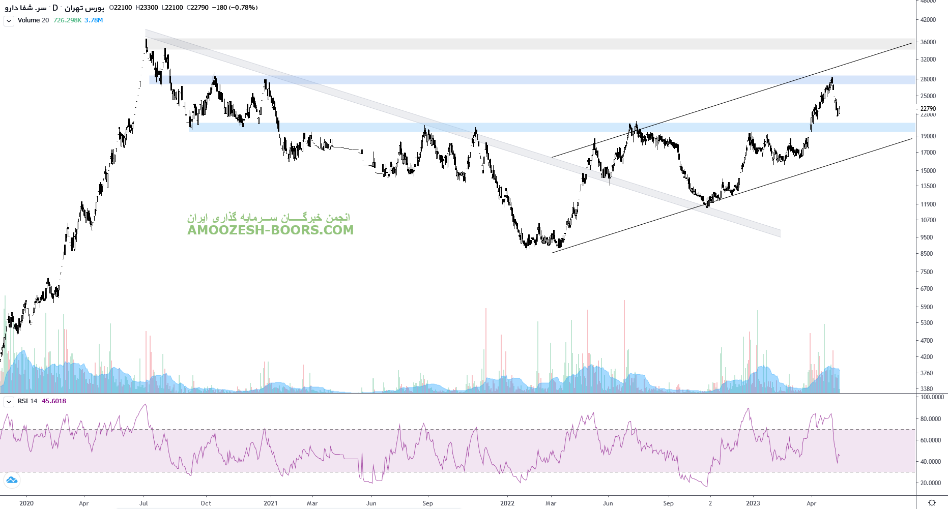 سهم شفا بر روی حمایت مهم ناحیه 16000 ریال قرار گرفته است لذا در صورت ایجاد تقاضا در کلیت بازار و همچنین عبور از مقاومت مهم ناحیه ۱۹۵۰۰ ریال، به روند صعودی بازگشته و لذا در همین مسیر مقاومتهای مهم 26000 ریال و ۳۱۵۰۰ ریال مقاومتهای مهم سهم شفا محسوب میشود. همچنین در صورت از دست رفتن حمایت مهم ناحیه 16000 ریال، مهمترین حمایت بعدی سهم شفا ناحیه ۱۴۰۰۰ ریال در نظر گرفته خواهد شد.