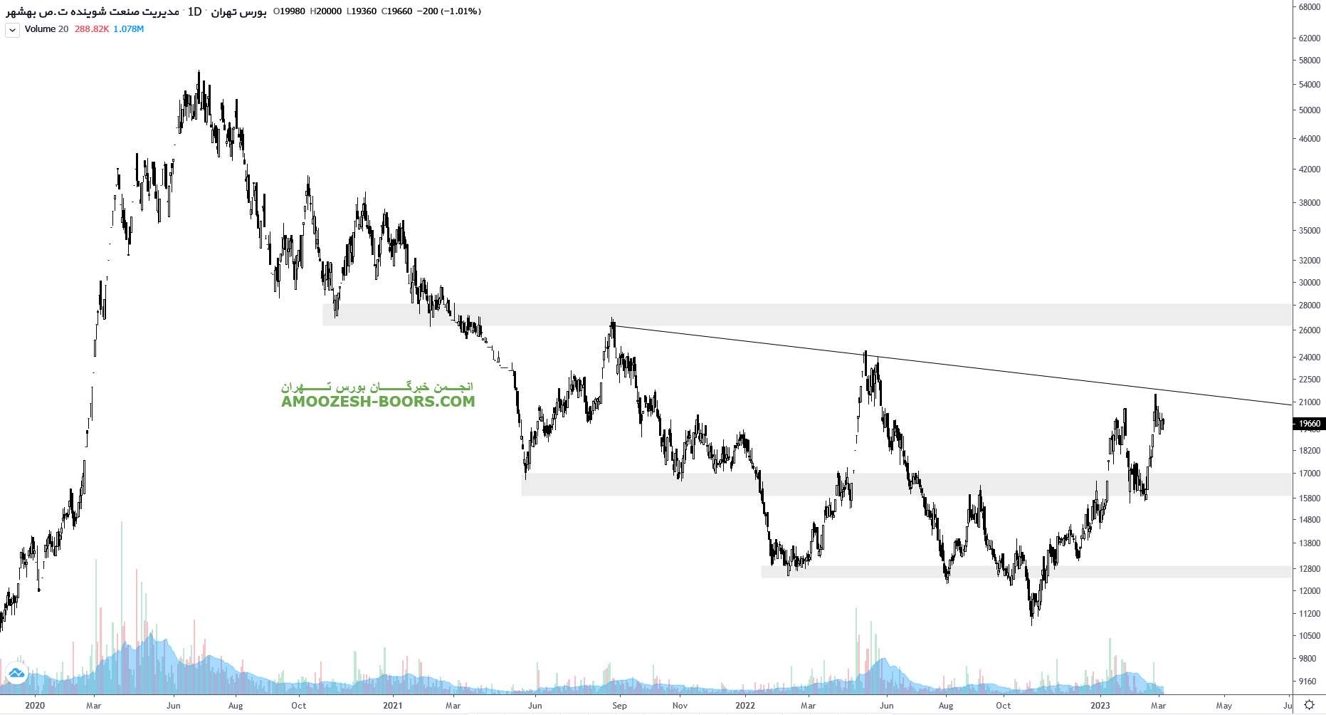 قیمت سهم شوینده اکنون بر روی مقاومت ناحیه خط روند نزولی قرار دارد که میتواند با عبور از این مقاومت رشد خود را تا ناحیه مقاومتی ۲۷۰۰تومان نیز ادامه دهد. همچنین در صورت تمایل قیمت به اصلاح، اولین حمایت سهم شوینده ناحی 1600 تومان تعییشده است.