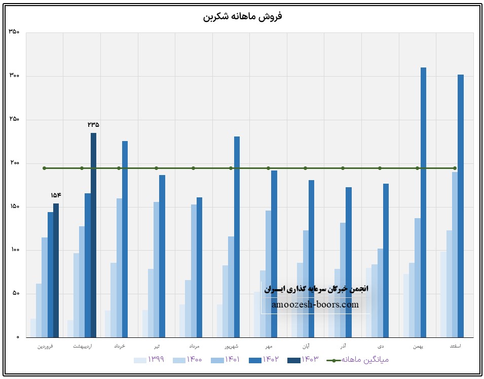 فروش سهم شکربن در این ماه کاهش 3% در مقایسه با ماه گذشته داشته است، همچنین در مقایسه به مدت مشابه 59% و نسبت به متوسط ماهانه 55% افزایش داشته است.