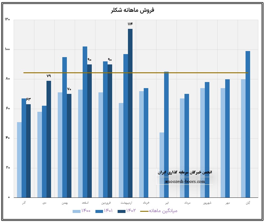 فروش سهم شکلر در این ماه افزایش 29% در مقایسه با ماه گذشته داشته است، همچنین در مقایسه به مدت مشابه 12% کاهش و نسبت به متوسط ماهانه 28% افزایش داشته است.