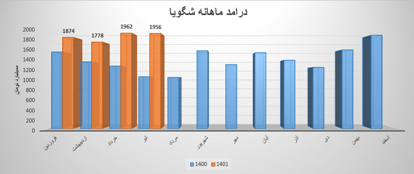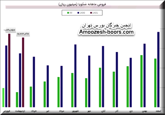 نماد شگویا در اردیبهشت رقم 17.772 میلیارد ریالی را ثبت کرده است. و این در حالی است که فروش اردیبهشت سال گذشته 13.735 میلیارد ریال و درآمد ماه گذشته 18.740 بود و نسبت به ماه گذشته کاهش 5 درصدی درآمد داشته است باید در نظر داشت شرکت توانسته تا پایان اردیبهشت 1401 حدود 19 درصد بودجه خود را از لحاظ مبلغ فروش، پوشش دهد.