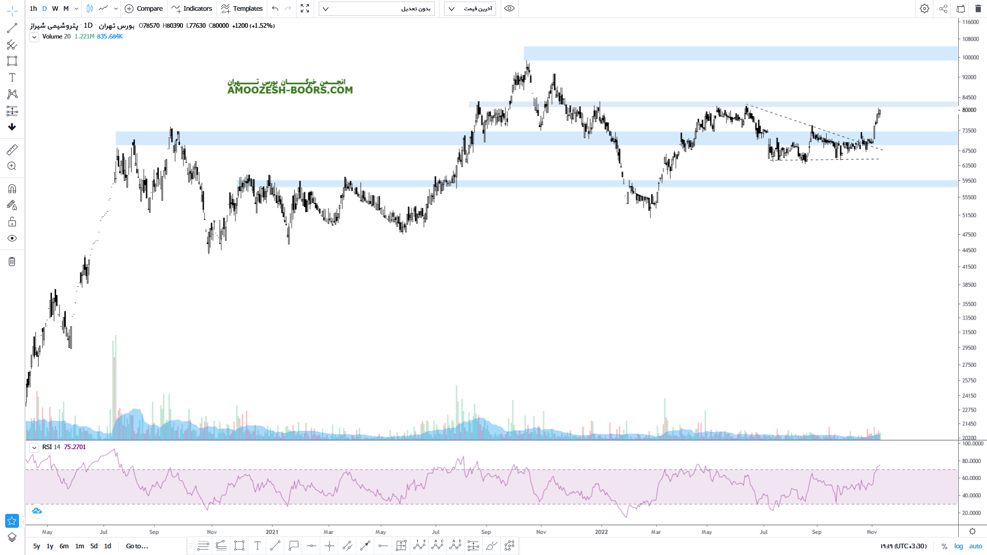 قیمتسهم شیراز پس از خروج از الگوی استراحت اکنون به مقاومت ناحیه 8200 تومان رسیده که میتواند با شکست این ناحیه مقاومتی رشد خود را تا مقاومت ناحیه 10000 تومان نیز ادامه دهد اما در صورت عدم توانایی قیمت در شکست این ناحیه مقاومتی، قیمت می تواند اصلاحی را تا ناحیه حمایتی 7000 تومان داشته باشد.