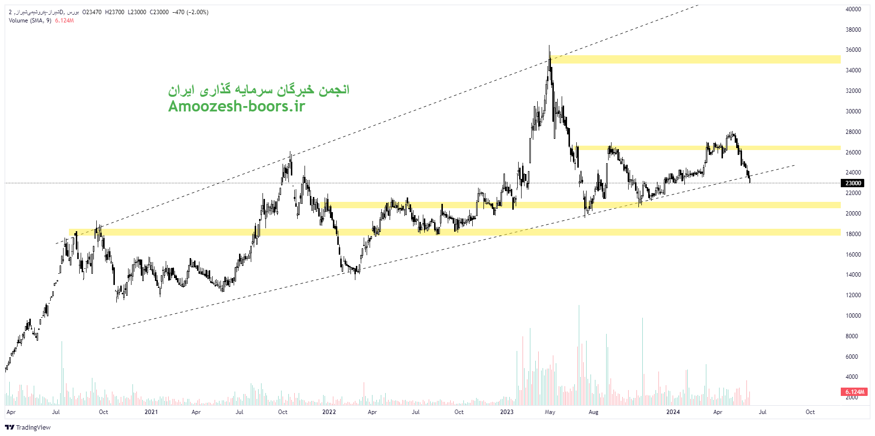 سهم شیراز با عبور از حمایت خط روند صعودی خود کنون به سمت حمایت ناحیه ۲۱۰۰۰ ریال در حال حرکت میباشد. لذا در صورت ایجاد تقاضا در کلیت بازار سهم شیراز از ناحیه مذکور مورد تقاضا قرار گرفته و به سمت اهداف ناحیه ۲۶۰۰۰ ریال و ۳۵۰۰۰ ریال حرکت خواهد کرد مچنین در صورت از دست رفتن حمایت ناحیه ۲۱۰۰۰ ریال نزدیکترین حمایت به سهم شیراز ناحیه ۱۸۰۰۰ ريال در نظر گرفته خواهد شد.
