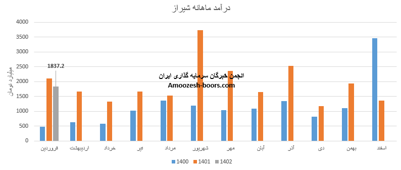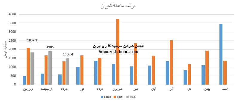 نماد شیراز (شرکت پتروشیمی شیراز) در اردیبهشت ماه سال 1402 حدود مبلغ 1905 میلیارد تومان درآمد داشته که این میزان در مقایسه با ماه گذشته ۴% و همچنین در مقایسه با مدت مشابه سال گذشته 14% افزایش پیدا کرده است.