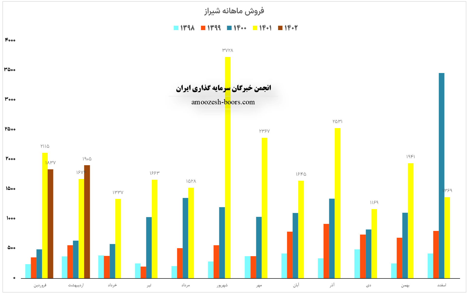فروش نماد شیراز: 22705 میلیارد تومان که نسبت به دوره مشابه گذشته 61% افزایش یافته است.