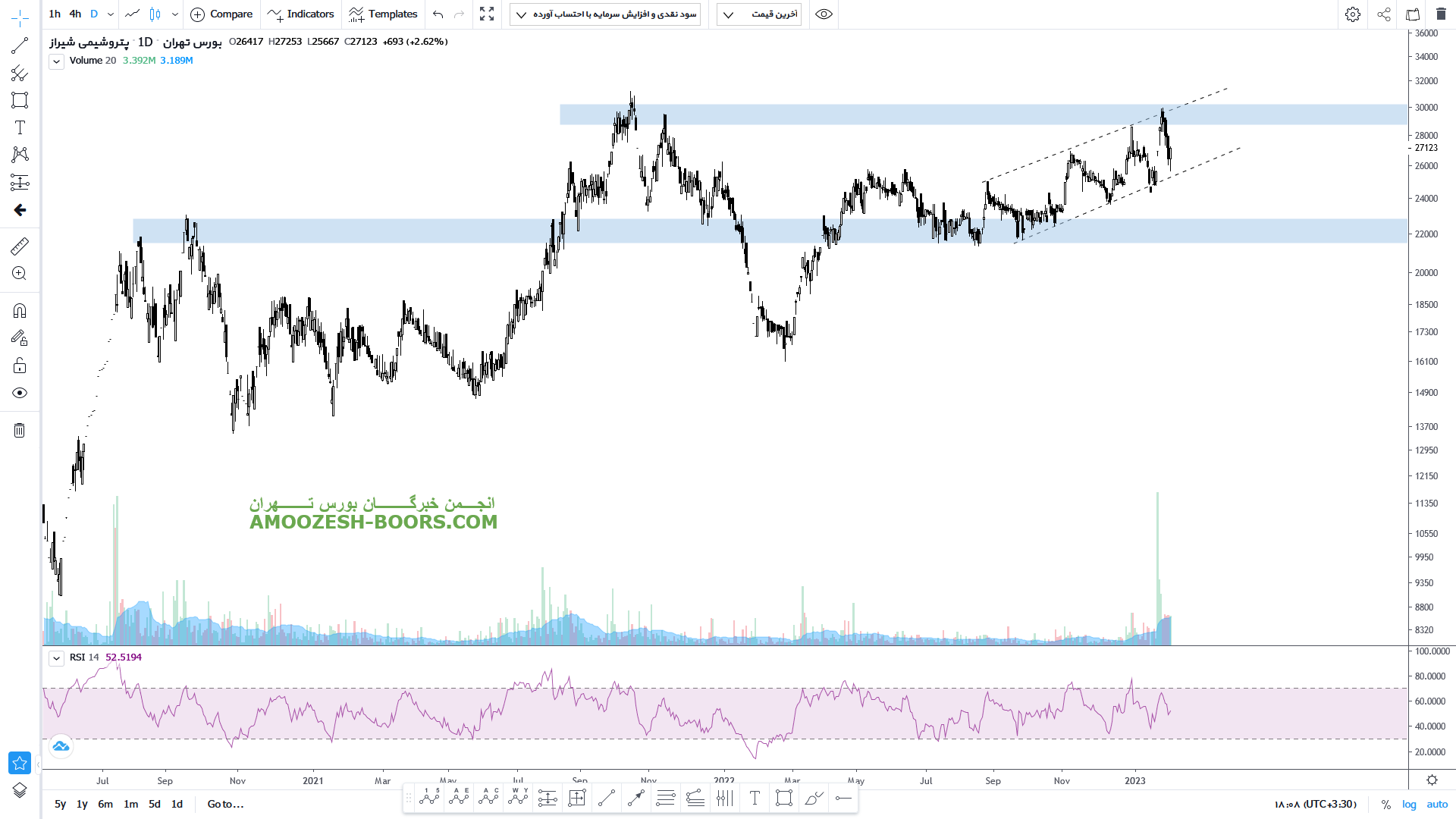 قیمت سهم شیراز در قالب یک کانال صعودی در حال رشد می باشد لذا در صورت از دست رفتن حمایت کف کانال حمایت بعدی سهم شیراز ناحیه 2200 تومان در نظر گرفته خواهد شد. لذا در صورت حفظ این ناحیه حمایتی، مقاومت بعدی سهم شیراز ناحیه 3000 تومان تعیین شده است.