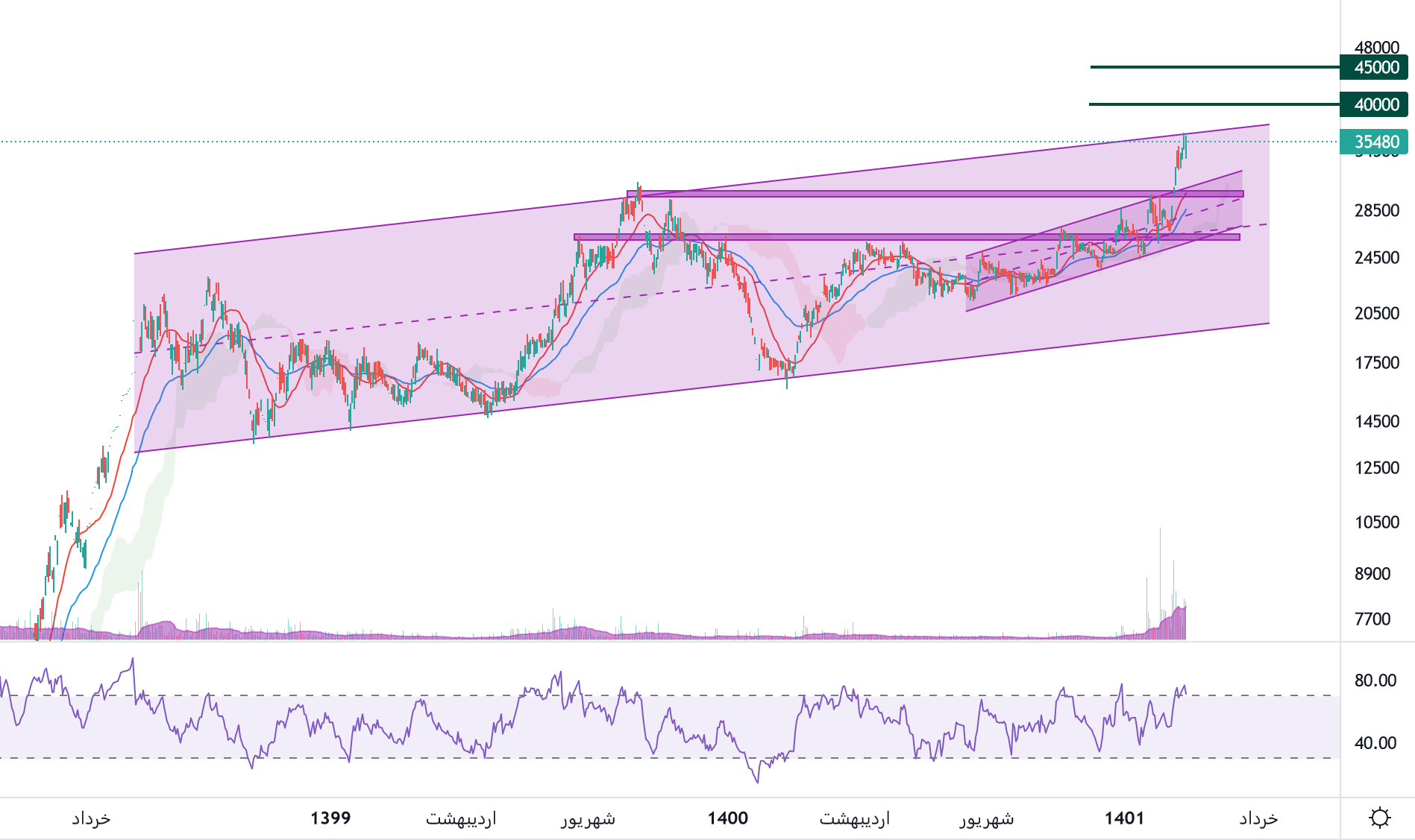 نماد شیراز درگیر محدوده مقاومتی سقف کانال صعودی شده، در صورت عبور از این محدوده و تثبیت بالای این سطح، مقاومت های سهم 40000 و 45000 ریال ارزیابی میگردد، همچنین در صورت ورود سهم شیراز به فاز اصلاحی حمایت های سهم 32500 و 30000 ریال خواهند بود.