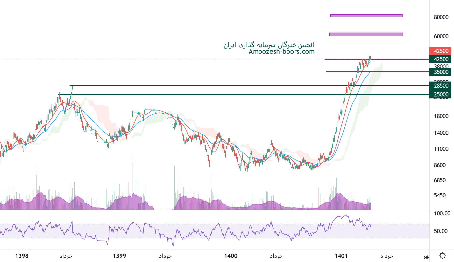 نماد غالبر درگیر سطح مقاومتی 42500 ریال میباشد، در صورت عبور قیمت از این سطح مقاومتی، محدوده مقاومت بعدی 60000 ریال میباشد، همچنین حمایت سهم 35000 ریال ارزیابی خواهد شد.