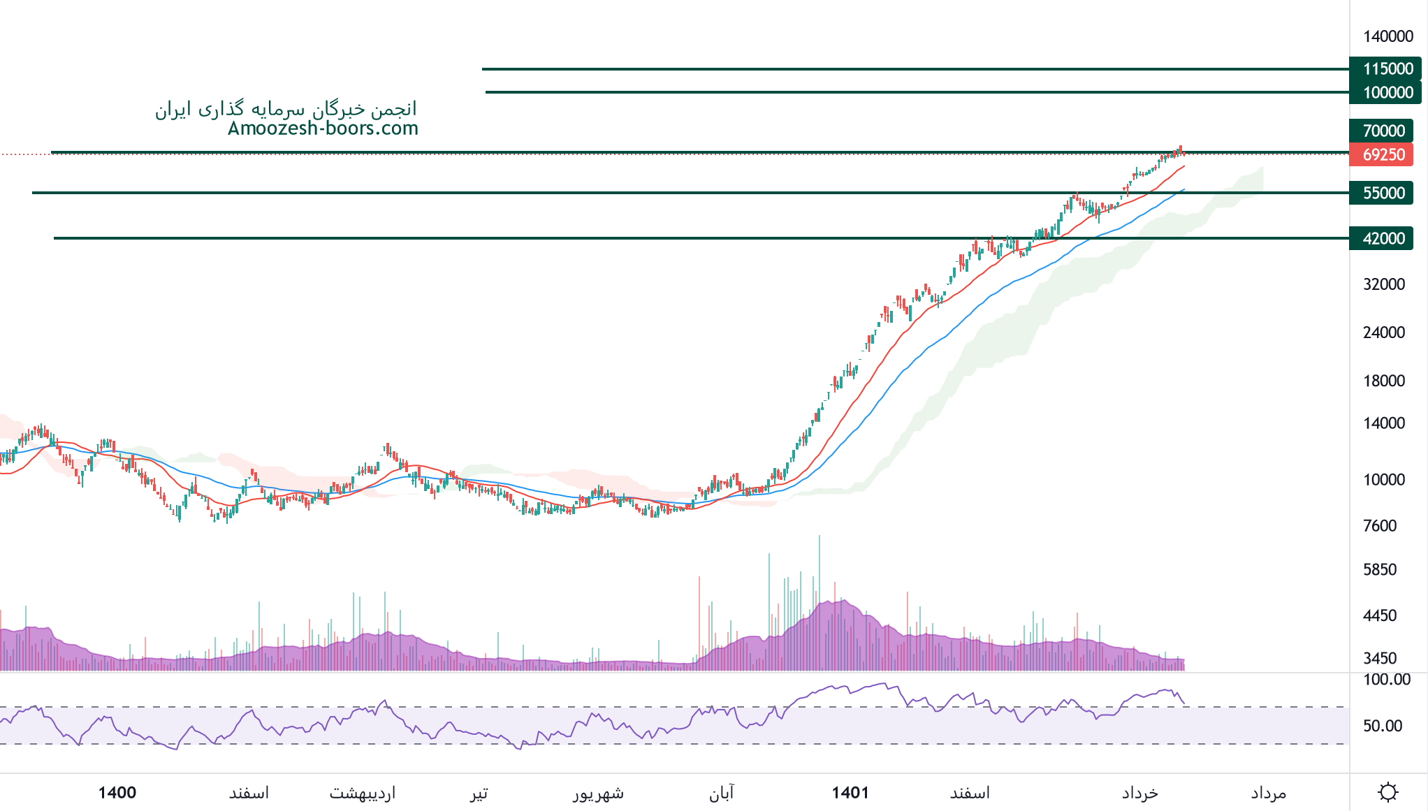 نماد غالبر به سطح مقاومت 70000 ریال رسیده، در صورت واکنش نشانه های منفی به این سطح، اصلاح قیمت تا 55000 ریال انجام خواهد شد، همچنین در صورت عبور قیمت از این سطح، مقاومت بعدی 100000 ریال در نظر گرفته خواهد شد.