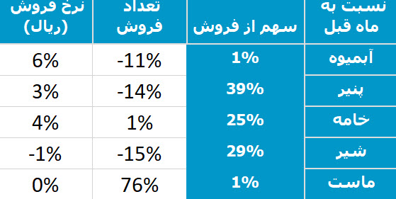 پر فروش ترین محصول غالبر ، پنیر با سهم 39 درصدی از فروش این ماه گزارش شده است . تغییرات در میزان و نرخ فروش محصولات سهم غالبر به سرح زیر میباشد :