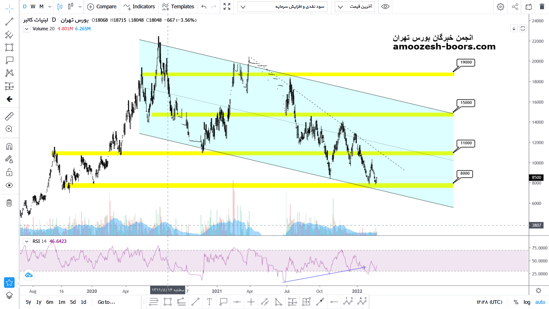 با توجه به عدم توانایی قیمت در شکست خط روند نزولی و بروز واکنش منفی نسبت به این محدوده و پس از نزول اکنون به محدوده حمایتی کف کانال نزولی خود نزدیک شده است در صورت حمایت از این محدوده میتواند نوسانی را رو به بالا تا محدوده مقاومت خط روند نزولی خود و همچنین محدوده مقاومتی کلاسیکی ۱۱۰۰ تومان تجربه کند یکی از شروط اصلی صعود بیشتر شکست خط روند نزولی خود میباشد که در صورت شکست میتواند رشد بیشتری را تا محدوده ۱۵۰۰ تومان تجربه کند اما در صورت بروز مجدد واکنش منفی نسبت به خط روند نزولی روند نزولی نماد ادامه خواهد داشت.
