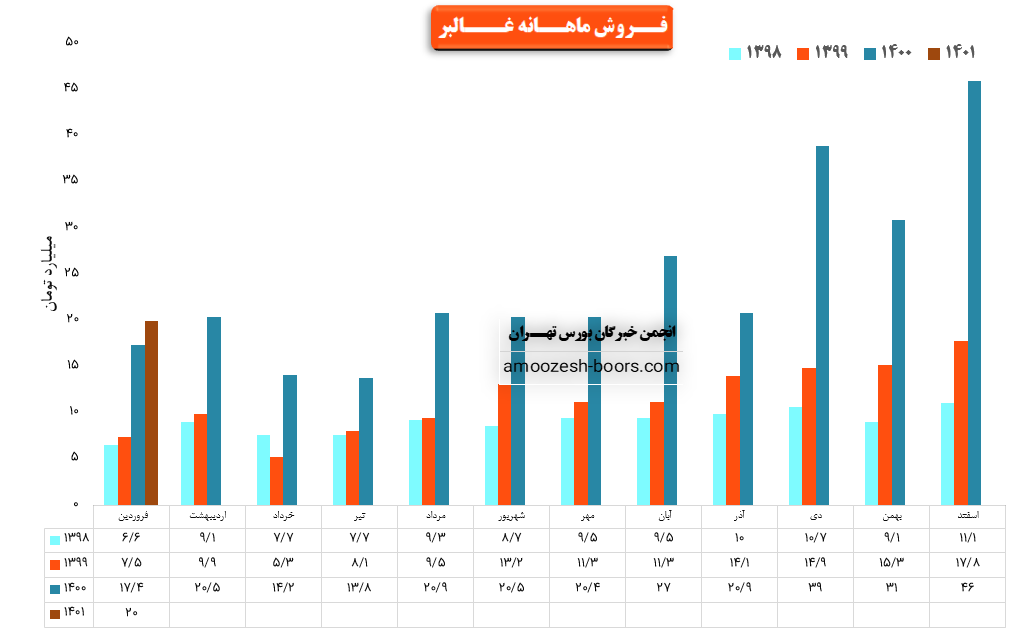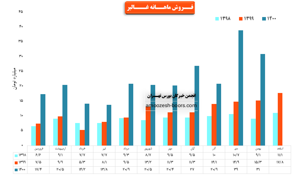 نماد غالبر بیش از ۴۷۲ هزار کیلوگرم از محصولات خود را در دی ماه به فروش رسانده است که این میزان در مقایسه با آذر ماه با ۱۸ % افت حجم فروش روبرو شده است. یکی از دلایل جبران افت حجم فروش رشد صادرات شرکت در دی ماه بوده است به این صورت که غالبر در دی ماه با ثبت بیش از ۲۸ میلیارد تومان صادرات حدود ۳۰۰ % نسبت به ماه قبل رشد صادرات را گزارش کرده است و همین موضوع نیز باعث شده افت ۱۸ درصدی فروش داخلی نه تنها جبران شده بلکه درآمد شرکت در مقایسه با ماه گذشته نیز افزایش چشمگیری داشته باشد.