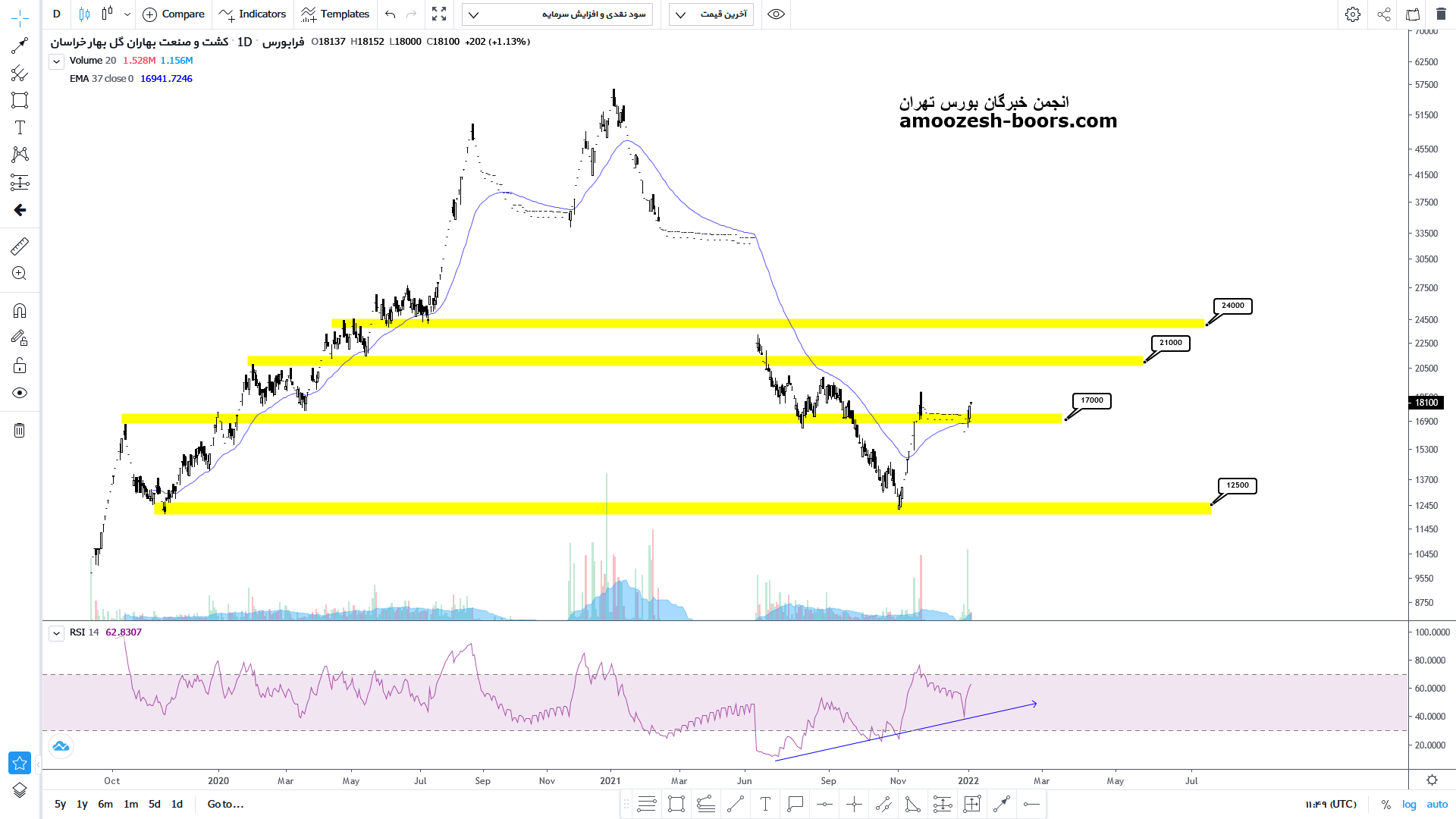 با توجه به رشد اخیر دو مقاومت مهم مووینگ اوریج و محدوده کلاسیکی 1700 تومان توسط قیمت شکسته شده و تبدیل به حمایت شده اند و اکنون پس از انجام پولبک در حال صعود به سمت مقاومت محدوده 2100 و سپس درصورت شکست آن صعود تا محدوده 2400 تومان میباشد
