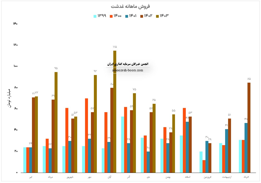 فروش غدشت در این ماه افزایش 37% در مقایسه با ماه گذشته داشته است، همچنین در مقایسه به مدت مشابه 46% افزایش و نسبت به متوسط ماهانه 3% کاهش داشته است.