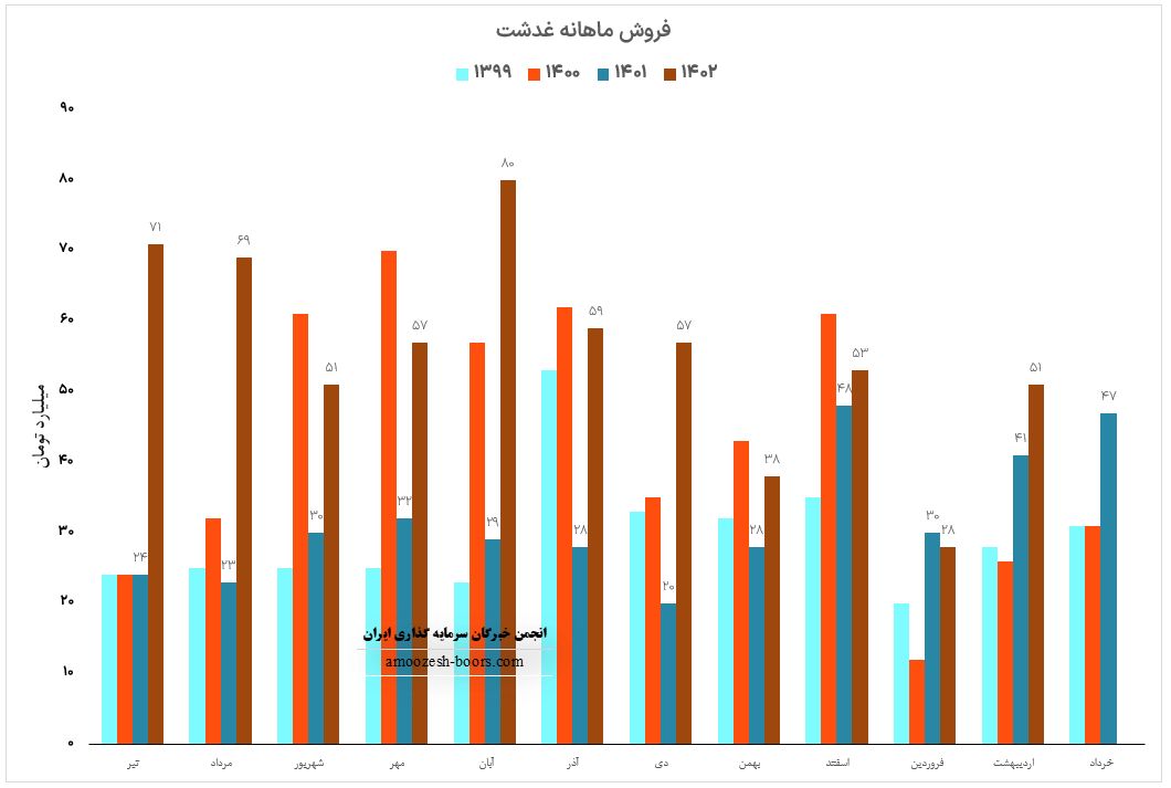 نماد غدشت در فروردین ماه سال 1402 سهم 9 درصدی از صادرات را به خود اختصاص داده و به درآمد 28 میلیارد تومانی رسیده است، این رقم نشان از تداوم روند نزولی در گزارشات ماهانه سهم غدشت داشته و تغییرات زیر را تجربه نموده است: