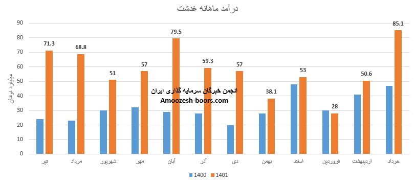 درآمد فرآورده های غذایی دشت مرغاب ( نماد غدشت ) در آخرین ماه از سال مالی به 85.1 میلیارد تومان رسیده و سال مالی سهم غدشدت با ثبت رکورد به اتمام رسید، این رقم در مقایسه با ماه گذشته 68%، نسبت به متوسط ماهانه 53% و نسبت به مدت مشابه 82% بیشتر بوده است، مجموع عملکرد 12 ماهه سهم غدشت افزایش 84 درصدی نسبت به کل درآمد سال قبلی داشته است، 11% از درآمد ماهانه نماد غدشت از طریق فروش صادراتی و مابقی از طریق فروش داخلی تامین گردیده است، محصول اصلی غدشت کنسرو های غیر گوشتی بوده است، نرخ فروش این محصول 3% و مقدار فروش آن 120% افزایش داشته است.