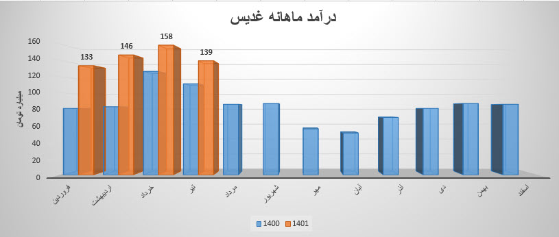 سهم غدیس در فروردین ماه حدود ۱۲ هزار لیتر از محصولات خود را به فروش رساند. این میزان نسبت به حجم فروش اسفند ماه حدود ۲۰ % افزایش پیدا کرده است. علاوه بر رشد ۲۰ درصدی حجم فروش رشد محسوس نرخ فروش محصولات این شرکت نیز دلیل اصلی افزایش ۵۵ درصدی مبلغ فروش در مقایسه با ماه گذشته بوده است.