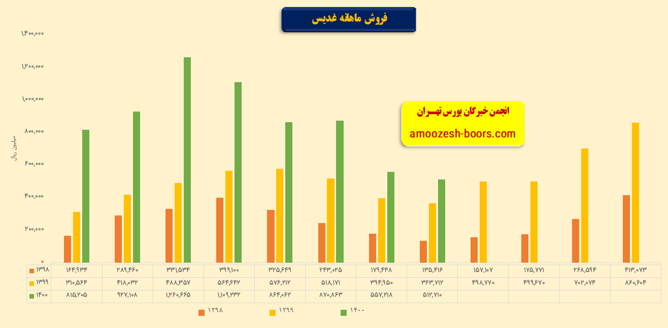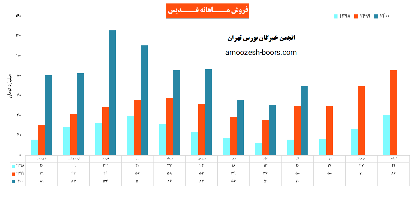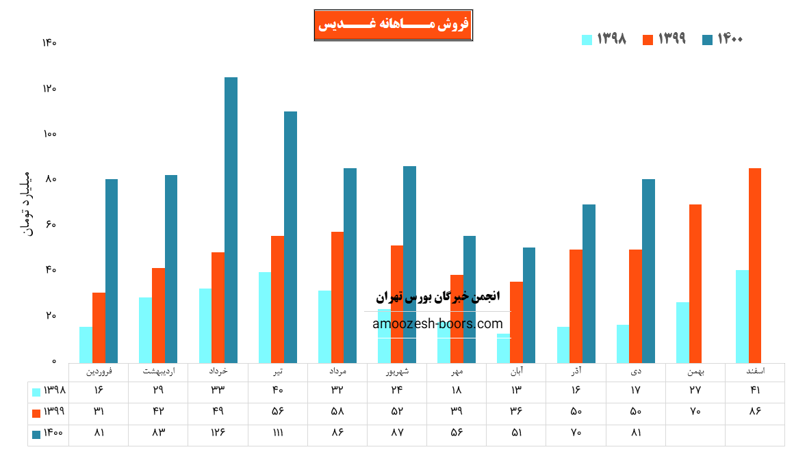 نماد غدیس در دی ماه 1400 مبلغ 81 میلیارد تومان درامد داشته که این میزان نسبت به ماه گذشته 16% و همچنین نسبت به مدت مشابه سال گذشته 62% رشد پیدا کرده است!