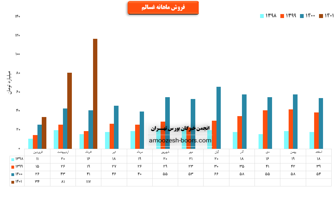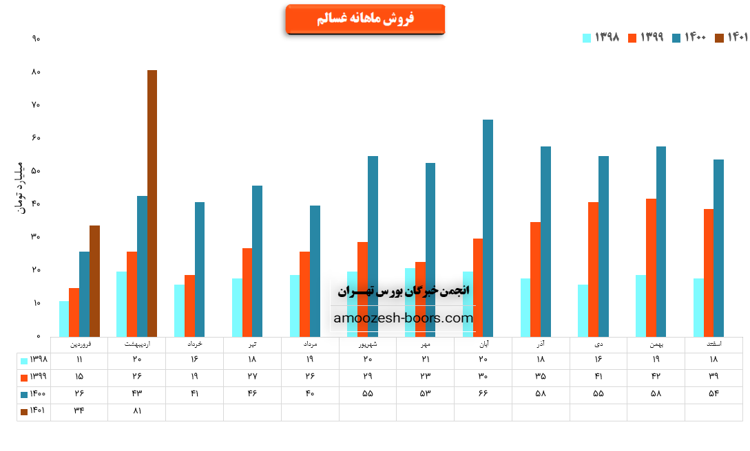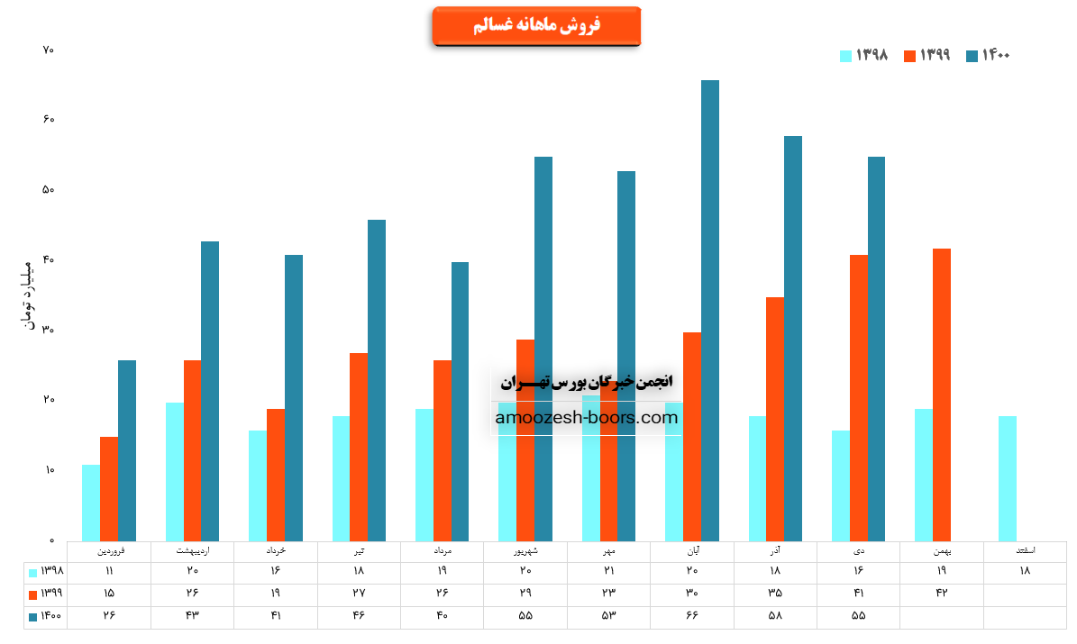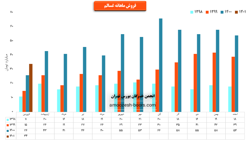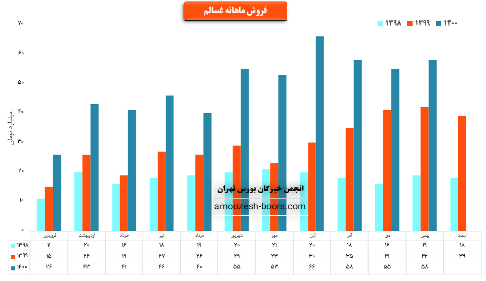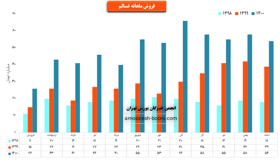 سهم غسالم در بهمن ماه بیش از 2000 هزار تن از محصولات خود را به فروش رسانده که در مقایسه با حجم فروش ماه گذشته حدود 40% کاهش حجم فروش پیدا کرده است.