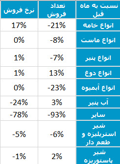 پر فروش ترین محصول شرکت شیر پاستوریزه پگاه آذربایجان غربی انواع پنیر با سهم 35 دزصدی در فروش ماهانه گزارش شده است .همچنین سایر تغییرات در مقدار و نرخ فروش محصولات غشاذر به شرح جدول زیر میباشد :