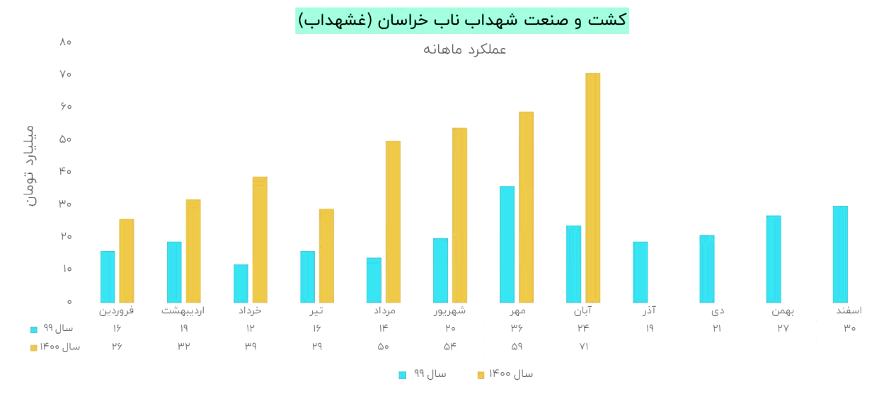 مقدار فروش شرکت کشت و صنعت شهداب ناب خراسان در مرداد ماه 3478 تن بوده که نسبت به تیرماه 71 درصد رشد داشته است. مقدار تولید شرکت در مردادماه 1851 تن بوده که نسبت به تیر 41 درصد رشد داشته است.