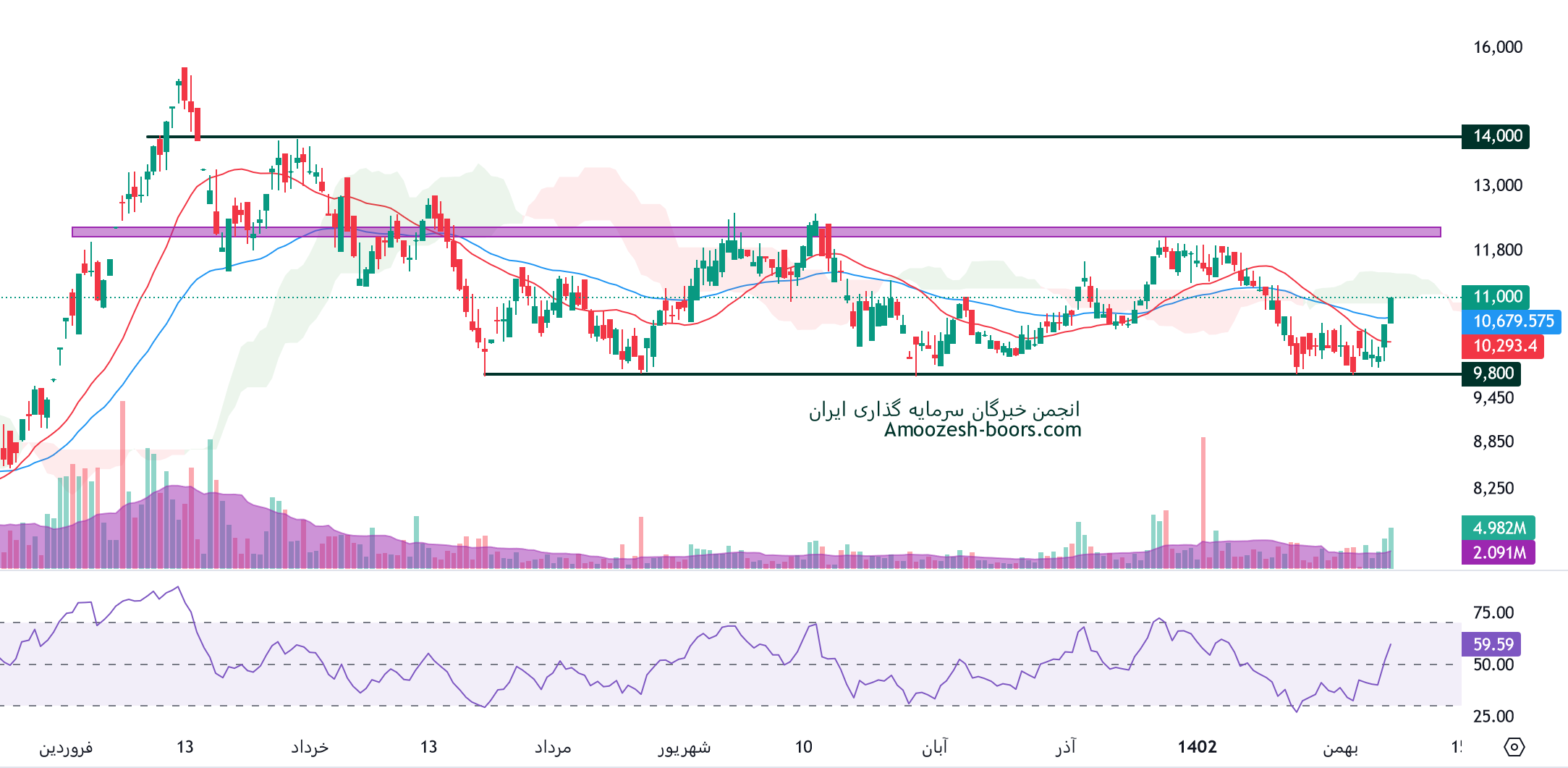 همانطور که در تحلیل تکنیکال غصینو میبینیم قیمت در محدوده حمایتی 9800 ریال و محدوده مقاومتی 12000 ریال در حال نوسان میباشد.