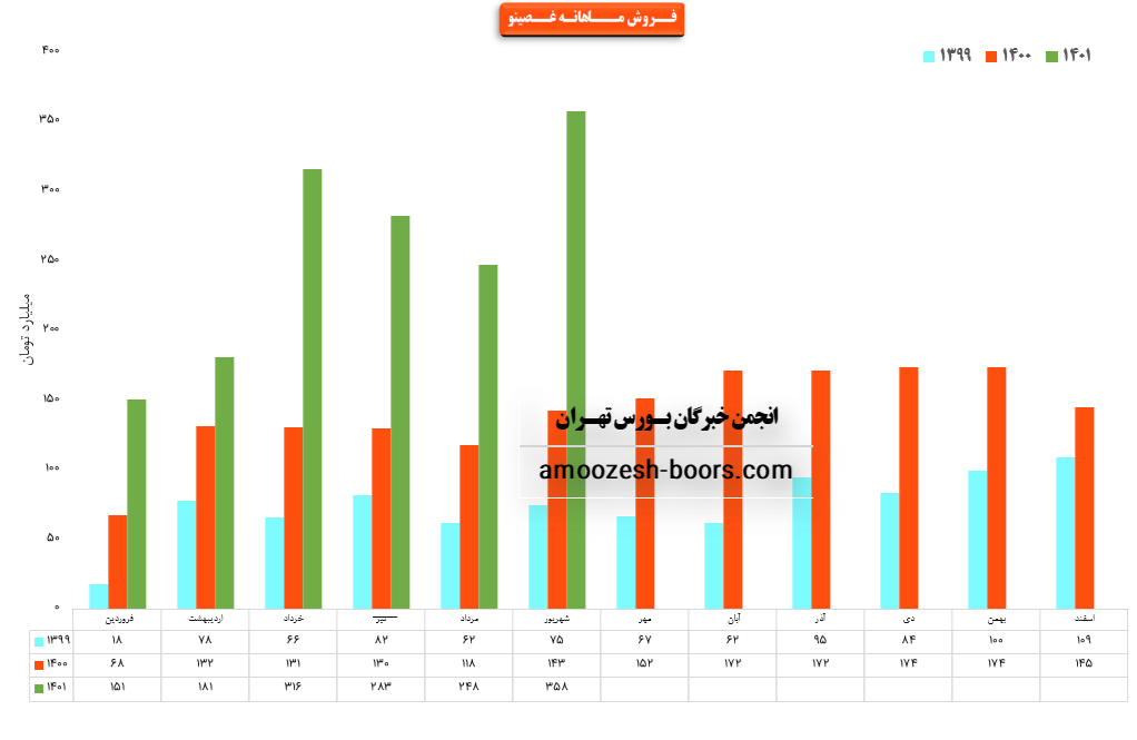 شرکت صنعتی مینو با نماد غصینو در مهر ماه سال ۱۴۰۱ حدود مبلغ 336 میلیارد تومان درآمد داشته که این میزان در مقایسه با ماه گذشته و همچنین در مقایسه با مدت مشابه سال گذشته به ترتیب 6% افت و 121% افزایش پیدا کرده است.