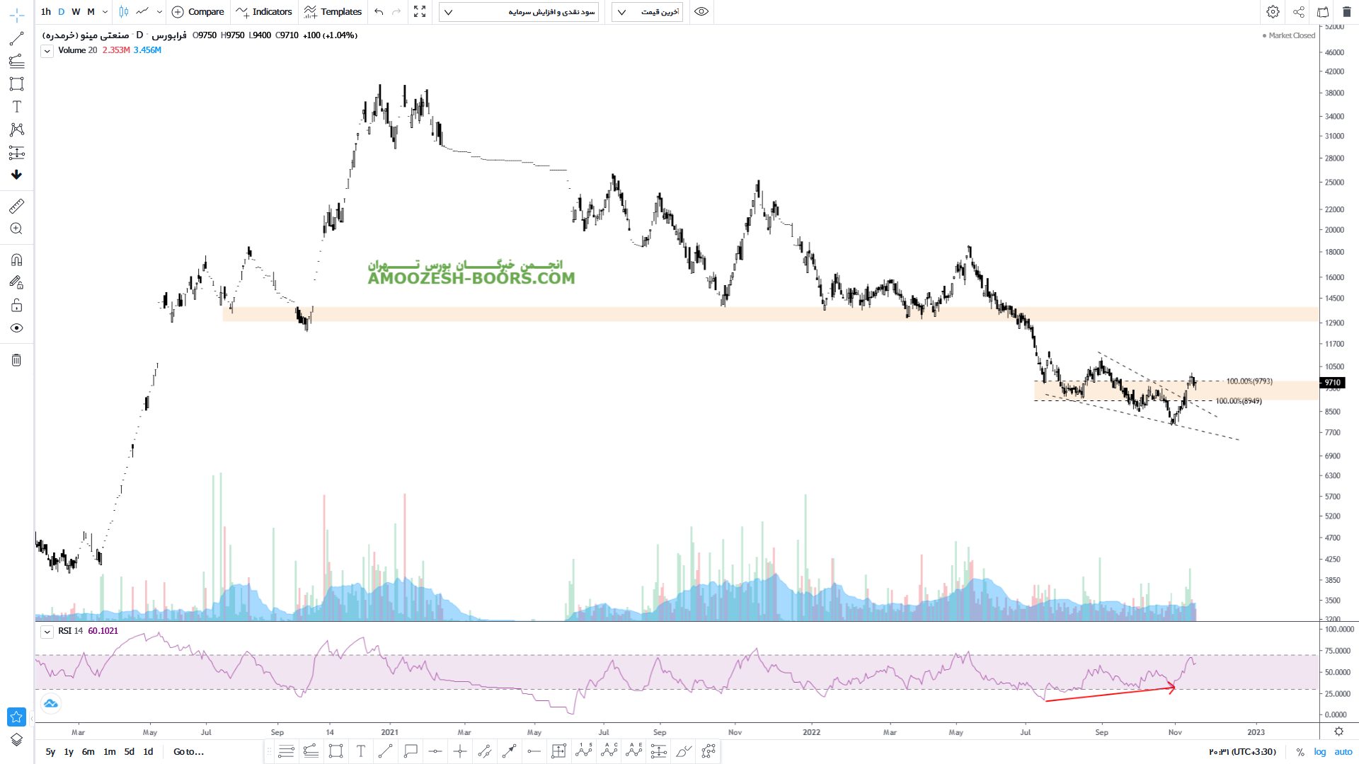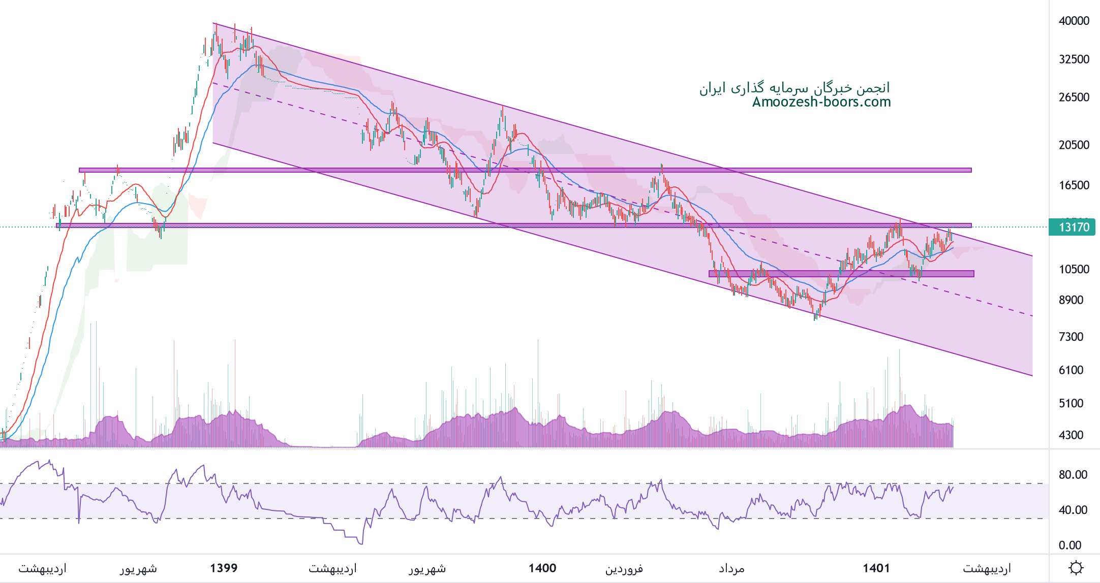 قیمت پس از ایجاد یک الگوی کنج نزولی بر روی ناحیه حمایتی ۹۰۰ تومان می تواند با ایجاد سر و شانه صعودی رشد خود را تا ناحیه مقاومتی مهم ۱۴۰۰ تومان ادامه دهد در صورت بروز واکنش منفی نسبت به این ناحیه مقاومتی اولین حمایت پیشروی قیمت ناحیه حمایتی 950 تومان میباشد.