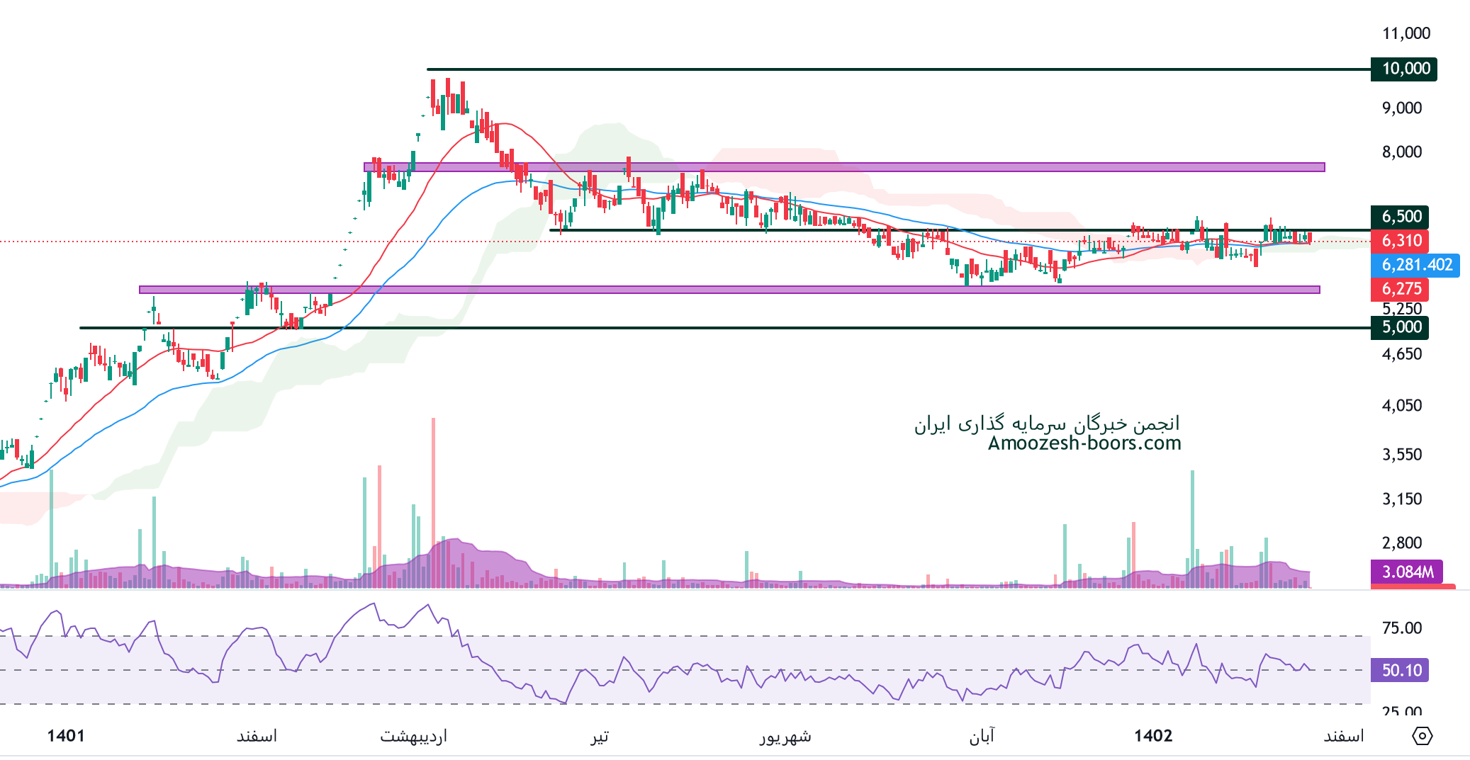 مقاومت نماد غمهرا از ناحیه پر تراکم 6500 ریال تشکیل شده است و با توجه به شرایط بازار شکست مقاومت و رسیدن به تارگت 10000 ریال خوش بینانه میباشد.