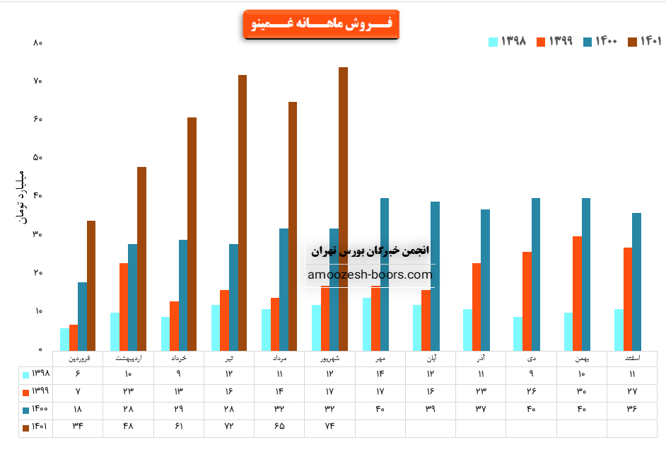 فروش نماد غمینو: 143 میلیارد تومان که نسبت به دوره مشابه گذشته 92% افزایش یافته است.