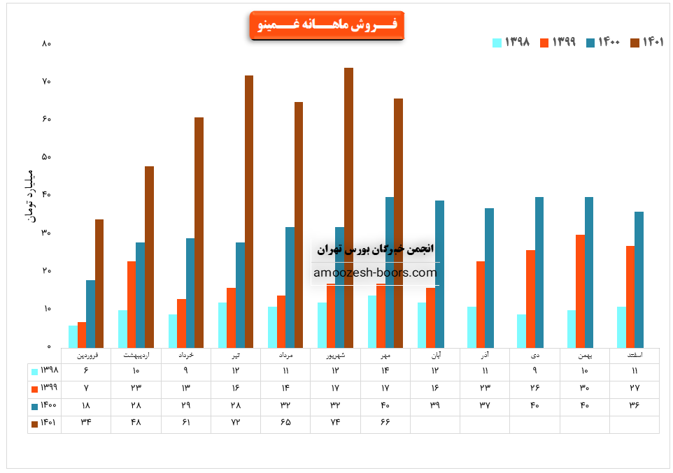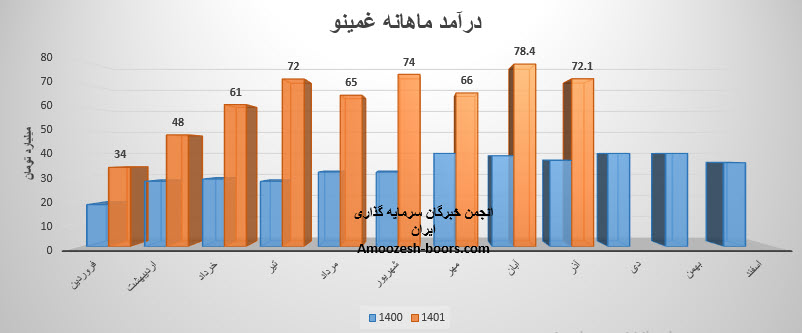 شرکت صنایع غذائی مینو شرق (سهم غمینو) در گزارش فعالیت یک ماهه آبان 1401 به درامد 78.4 میلیارد تومانی دست یافت . 26% از درآمد آبان ماه سهم غمینو از محل صادرات و مابقی از طریق فروش داخلی تامین گردید. همچنین پر فروش ترین محصول غمینو ، بیسکویت با سهم 79 درصدی گزارش گردیده است . نرخ فروش این محصول نسبت به ماه قبل رشد 9 درصدی را تجربه نموده است. تغییرات درآمد ماهانه سهم غمینو به شرح زیر میباشد :
