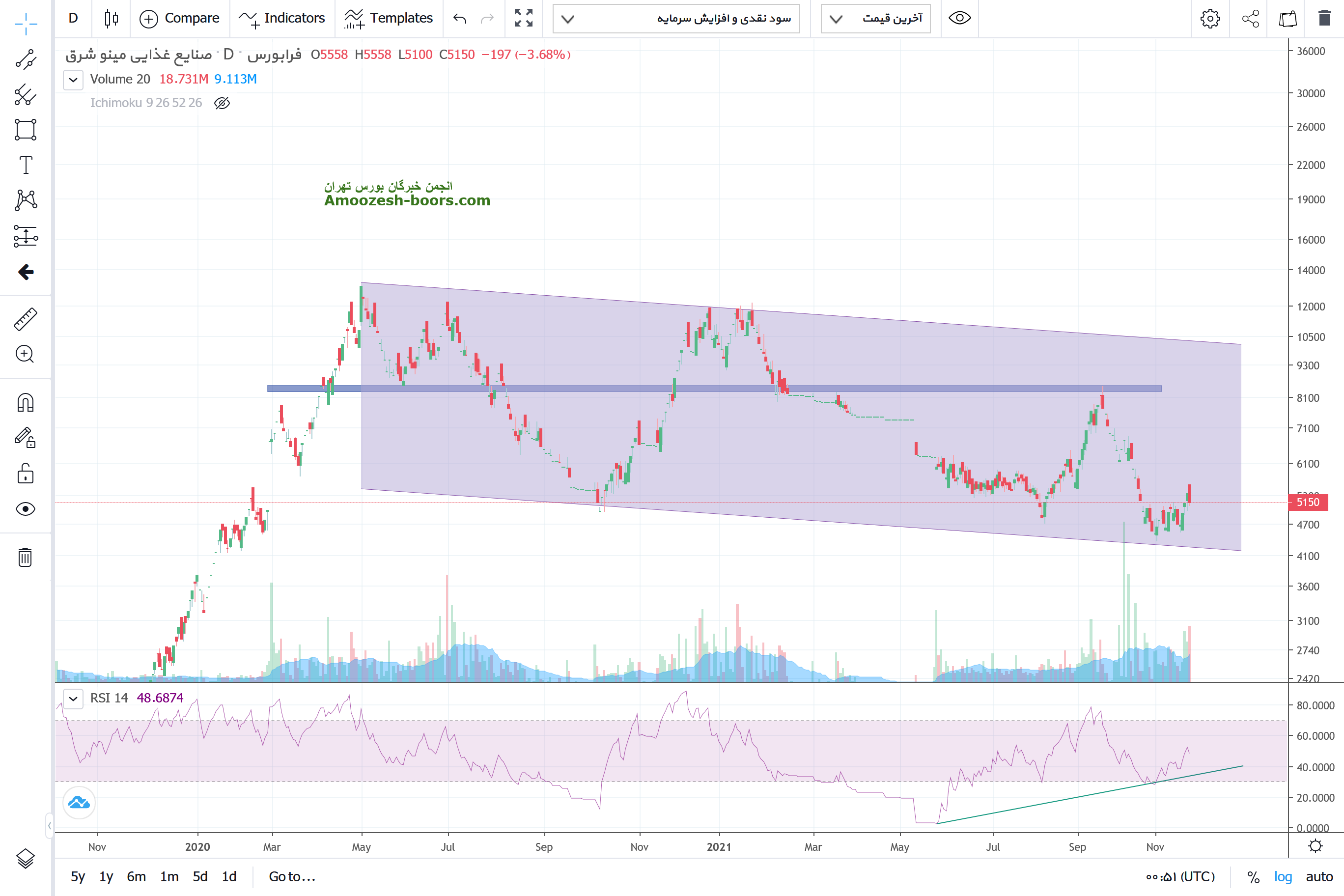 قیمت نماد غمینو با ایجاد واگرایی مثبت درتلاقی ناحیه حمایت استاتیک ،دره قیمتی قبلیو کف کانال در حال تثبیت میباشد ، مقاومت های 5500 و 6500 بر سر راه سهم وجود داشته و میتوان سهم را برای ورود پله ای زیر نظر داشت و در صورت سناریو بدبینانه و شکست این سطح بر اثر فشار فروش حد ضرر فعال خواهد شد .
